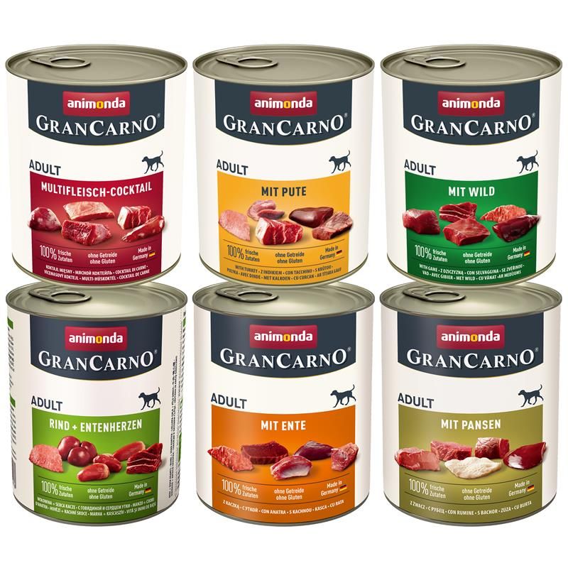 GranCarno Adult steht für ausgewogene, leckere gesunde Ernährung auf höchstem Niveau für ausgewachsene Hunde von 1 - 6 JahrenDie ausgewählten, frischen fleischlichen Rohstoffe garantieren den unvergleichlichen Geschmack, den Hunde so sehr schätzen. GranCarno Adult versorgt den ausgewachsenen Hund mit allen lebenswichtigen Nährstoffen.Zusammensetzung: Multifleisch-Cocktail: 38 % Rind (Lunge, Fleisch, Leber, Nieren, Euter, Herz), 18 % Huhn (Herz, Hals, Magen), 6 % Putenherzen, 6 % Wildfleisch, Calciumcarbonat, Natriumchlorid. Mit Pute: 53 % Schwein (Herz, Leber, Lunge, Fleisch), 29 % Putenbrühe, 15 % Pute (Hälse, Magen), Mineralstoffe, Distelöl. Mit Wild: 53 % Schwein (Herz, Leber, Lunge, Fleisch), 29 % Wildbrühe, 15 % Wildfleisch, Mineralstoffe, Distelöl. Rind + Entenherzen: 56 % Rind (Fleisch, Leber, Lunge, Herz, Nieren, Euter), 12 % Entenherzen, Calciumcarbonat, Natriumchlorid. Mit Ente: 48 % Schwein (Herz, Lunge, Leber, Fleisch), 20 % Ente (Fleisch, Magen), Natriumchlorid. Mit Pansen: 48 % Schwein (Herz, Leber, Lunge, Fleisch), 20 % Pansen, Natriumchlorid. Analytische Bestandteile:Multifleisch-Cocktail; Rind + Entenherzen: Protein 11 %, Fettgehalt 8,5 %, Rohfaser 0,5 %, Rohasche 1,8 %, Feuchtigkeit 77 %. Mit Pute; mit Wild: Protein 10,5 %, Fettgehalt 5 %, Rohfaser 0,4 %, Rohasche 2,5 %, Feuchtigkeit 79 %. Mit Ente: Protein 11,5 %, Fettgehalt 4,5 %, Rohfaser 0,3 %, Rohasche 2,2 %, Feuchtigkeit 79 %. Mit Pansen: Protein 11 %, Fettgehalt 4,5 %, Rohfaser 0,3 %, Rohasche 2 %, Feuchtigkeit 80 %. Ernährungsphysiologische Zusatzstoffe:Multifleisch-Cocktail; Rind + Entenherzen: 200 IE 3a671, 0,75 mg 3b202, 1,4 mg 3b503, 25 mg 3b605. Mit Pute; mit Wild: 200 IE 3a671 IE, 1,4 mg 3b503, 25 mg 3b605, 0,5 mg 3b405. Mit Ente, mit Pansen: 200 IE 3a671, 0,75 mg 3b202, 0,5 mg 3b405, 1,4 mg 3b503, 25 mg 3b605.Fütterungsempfehlung:Multifleisch-Cocktail; Rind + Entenherzen: Gewicht des Hundes           Tagesration       07 - 15 kg                   0400 - 0700 g       20 - 30 kg                   0870 - 1180 g       40 - 45 kg                   1465 - 1600 g Mit Ente: Gewicht des Hundes           Tagesration        07 - 11 kg                   0400 - 0600 g        16 - 22 kg                   0800 - 1000 g         30 - 40 kg                   1200 - 1600 g Mit Pansen: Gewicht des Hundes           Tagesration        06 - 10 kg                   0400 - 0600 g        15 - 20 kg                   0800 - 1000 g        26 - 38 kg                   1200 - 1600 g Mit Pute; mit Wild: Gewicht des Hundes           Tagesration        03 - 10 kg                   0235 - 0575 g        16 - 35 kg                   0800 - 1475 gInverkehrbringer: animonda petcare gmbh, Frankfurter Straße 31, 49214 Bad Rothefelde, Tel.: 05424/809340, E-Mail: info@animonda.de