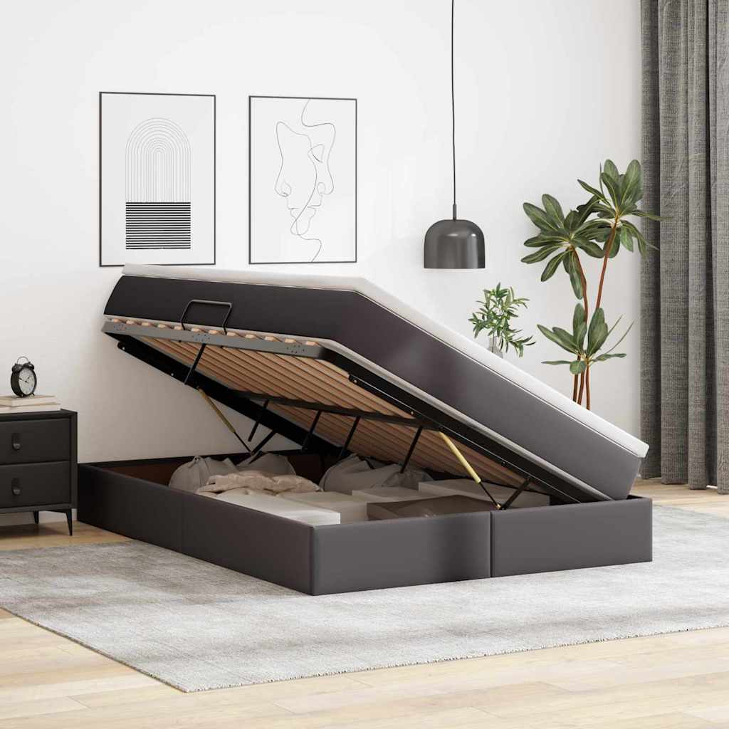 Das Stauraumbett mit Matratze ist ein modernes und schickes Möbelstück, das Platz spart und gleichzeitig höchsten Komfort bietet. Ideal für alle, die stylische und praktische Möbel mögen, verbindet dieses Bett schlichte Eleganz mit einem coolen Touch. Perfekt für moderne Räume, sind die klaren Linien einfach stylisch und sorgen für eine gemütliche Wohlfühl-Atmosphäre. Es ist nicht nur bequem, sondern auch super praktisch und bietet viel Stauraum, ohne Kompromisse beim Komfort einzugehen. Schlaf gut auf einer ausgewogenen Matratze und genieße einen ordentlichen Raum. Robuster Metallrahmen: Hochwertiges Metall sorgt für Stabilität und Langlebigkeit. Der feste Lattenrost bildet eine stabile Basis für erholsamen Schlaf und macht das Bett ideal für den täglichen Einsatz. Geräumiger Stauraum unter dem Bett: Dank hydraulischem Lift-Mechanismus gibt's viel Platz zum Verstauen. Perfekt für Bettwäsche, Kleidung oder andere Sachen, damit dein Schlafzimmer aufgeräumt bleibt. Elegantes Kunstleder-Finish: Das Bett ist mit hochwertigem Kunstleder bezogen, das ihm einen schicken Look verpasst. Es ist nicht nur robust und leicht zu reinigen, sondern verleiht deinem Schlafzimmer auch einen Hauch von Klasse. Bequeme Matratzen-Erfahrung: Die gemütliche Matratze aus Schaum und Taschenfedern sorgt für mittlere Festigkeit und unterstützt alle Schlafpositionen. Sie reduziert Bewegungsübertragung und bietet einen ausgewogenen Komfort für erholsame Nächte. Effizienter Montageprozess: Die Montage ist einfach, du brauchst nur zwei Personen und einen Schraubendreher. Die klaren Anleitungen sorgen für eine schnelle Einrichtung, so kannst du dein neues Bett ohne großen Aufwand genießen.