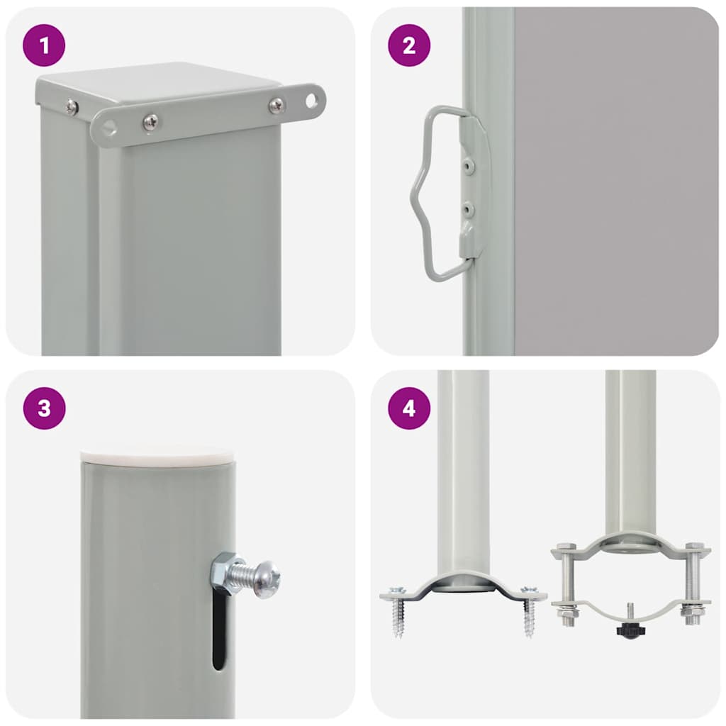 Diese schlichte und zugleich stilvolle Seitenmarkise schafft eine gemütliche kleine Ecke und bietet die Privatsphäre, die Sie auf Ihrer Terrasse oder auf Ihrem Balkon benötigen. Sie wird auch vor Wind und starken Sonnenstrahlen schützen. Der Sichtschutz besteht aus UV- und reißfestem Polyester. Die Kassette wird in vertikaler Position auf einem stabilen Eisensockel montiert, so dass die ausziehbare Markise leicht herausgezogen werden kann. Die Markise verfügt außerdem über eine automatische Rückrollfunktion. Dieser Balkon-Sichtschutz ist einfach zu montieren. Montage-Zubehör im Lieferumfang enthalten.