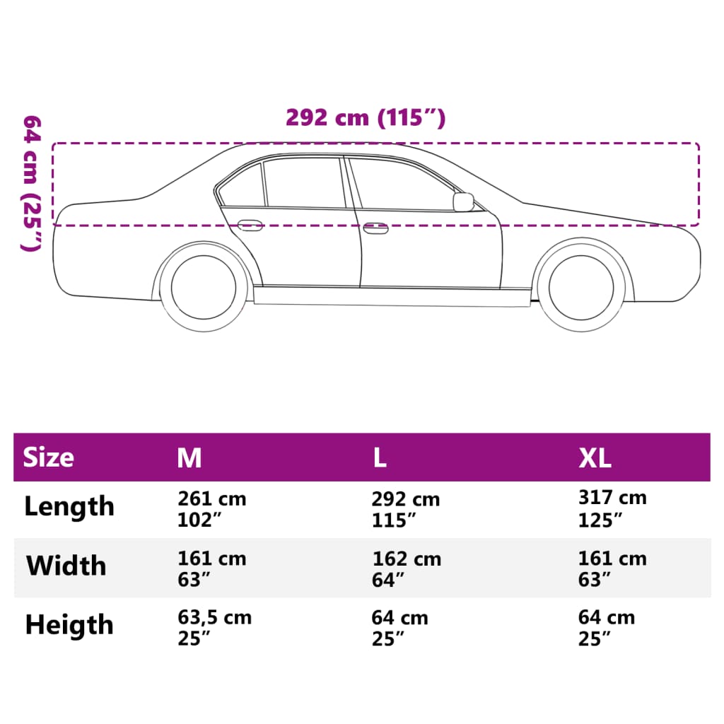 Diese Halbgarage schützt dein Fahrzeug vor UV-Strahlen, Kratzern, Schnee, Regen, Frost, Staub, Laub, industrieller Verschmutzung und Vogelkot und eignet sich ideal für den Innen- und Außenbereich. Mehrschicht-Material: Die Autoabdeckung besteht aus drei Schichten: Aluminiumfolie, PEVA und weicher Baumwolle und bietet dadurch einen hervorragenden Schutz vor Wasser, Staub, UV-Strahlen und Kratzern.Silberbeschichtung zur Wärmeisolierung: Die silberne Oberfläche der Autoplane reflektiert mehr Sonnenlicht und UV-Strahlen und hält dein Auto bei heißem Wetter kühler. Dies schützt den Innenraum deines Autos vor Hitzeschäden.Winddichtes Design: Mit den Gummibändern mit Haken lässt sich die Autoabdeckung sicher an Radnaben und Fahrgestell befestigen, um das Wegwehen bei Wind zu verhindern.Einfache Lagerung: Diese Autoschutzhülle wird samt einer praktischen Aufbewahrungstasche geliefert, in der sie sich bei Nichtgebrauch leicht verstauen lässt. Gut zu wissen:Bitte nimm vor dem Erwerb genaue Messungen deines Autos vor, um sicherzustellen, dass du die richtige Größe auswählst.