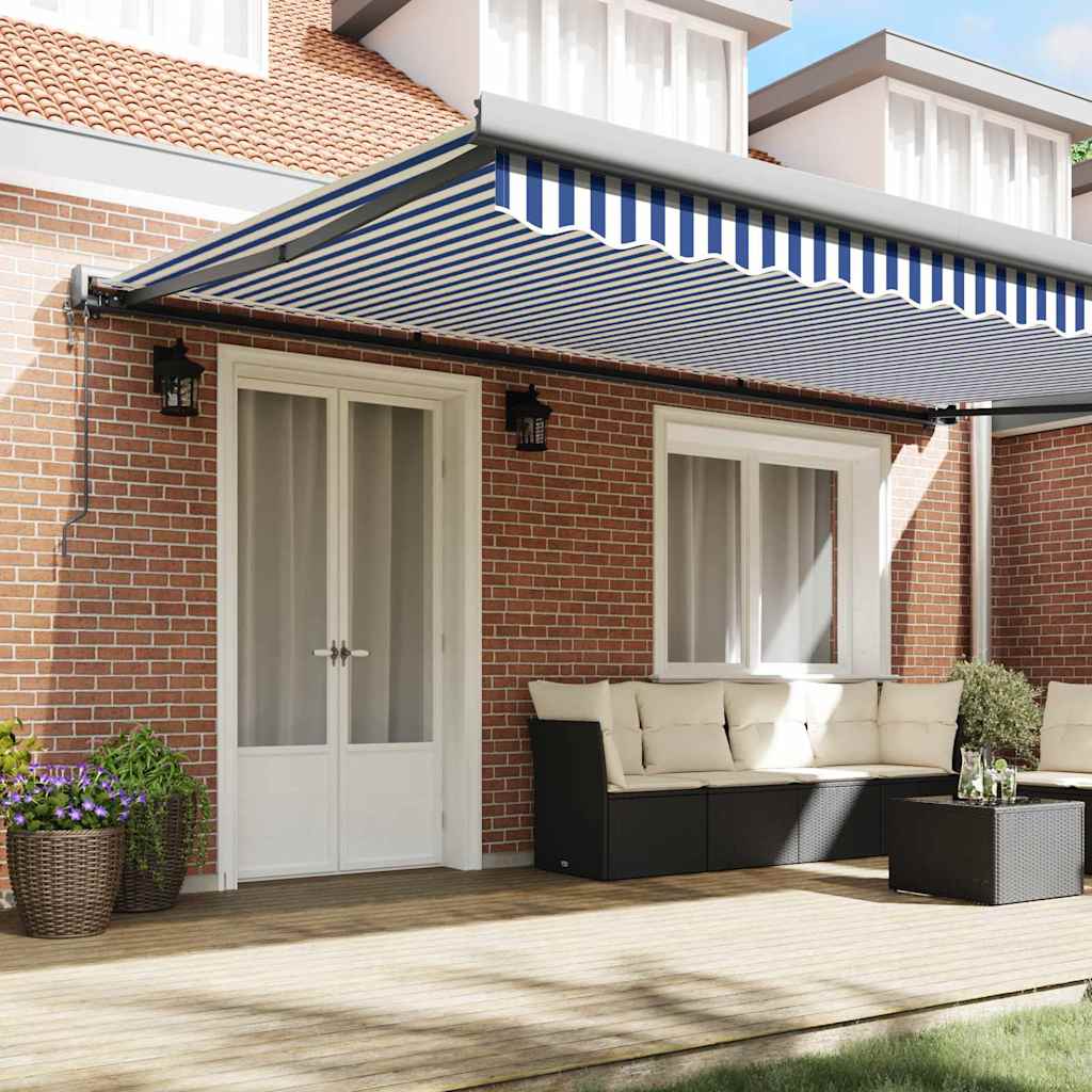 Gib deinem Außenbereich einen frischen Look mit der vidaXL automatischen einziehbaren Markise, die Funktionalität und Stil vereint ? perfekt für Balkone oder Terrassen. Diese große Markise hat ein schönes blau-weiß gestreiftes Design und kombiniert Stil mit Haltbarkeit. Hergestellt aus hochwertigem Polyester, sieht sie toll aus und hält jedem Wetter stand.