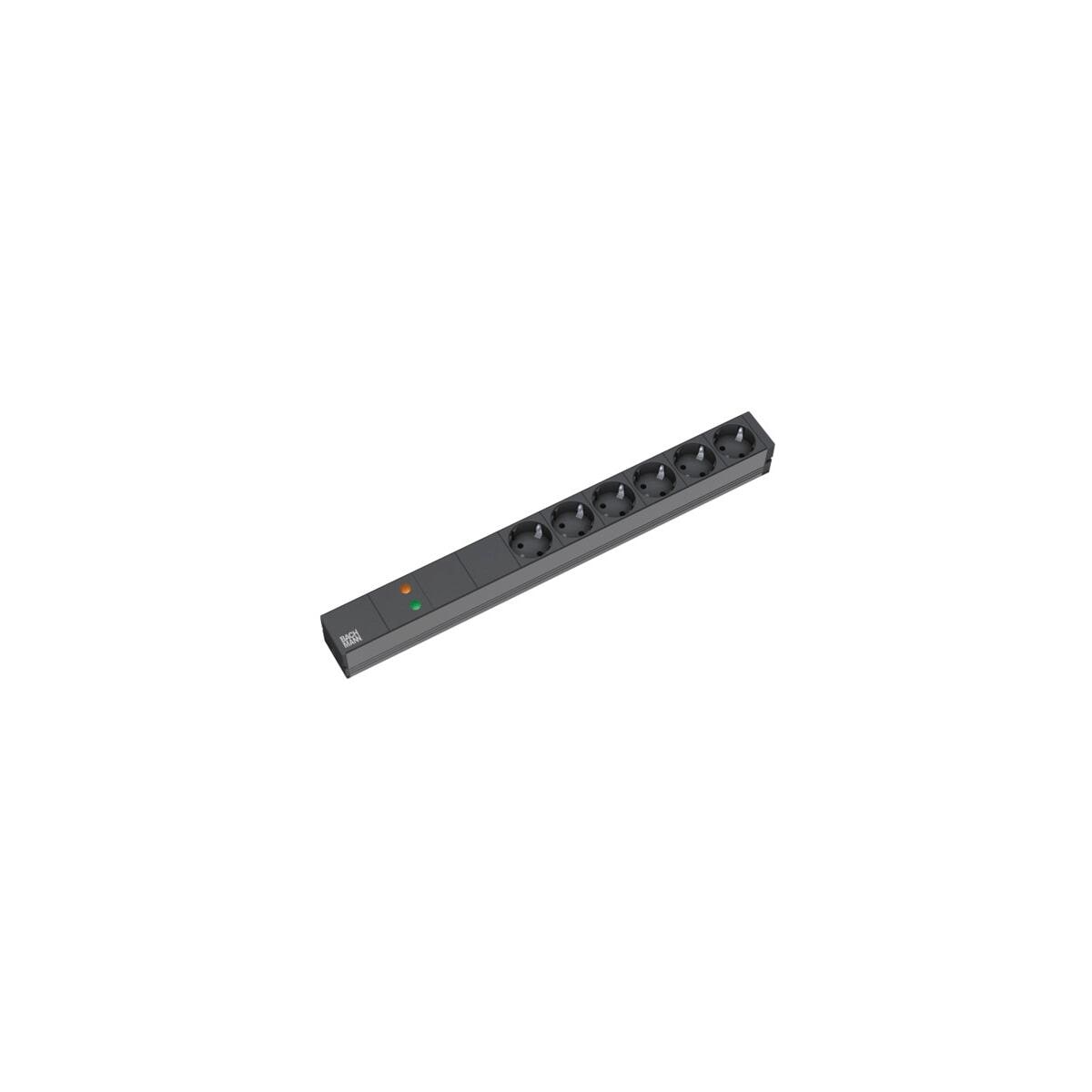 Bachmann 19° Steckdosenleiste, Alu, 1 HE, schwarz mit Überspannungsschutz 6,5kA + Netz- und Frequenzfilter ( GVS ), Profil: ALU 1HE schwarz, 6x Schutzkontaktsteckdosen schwarz Länge: 438,5mm, Endstücke genietet, nicht öffenbar, 2m H05VV-F 3G1,50mm² schwarz mit Schutzkontakt - Winkelstecker, inkl. Haltewinkel.