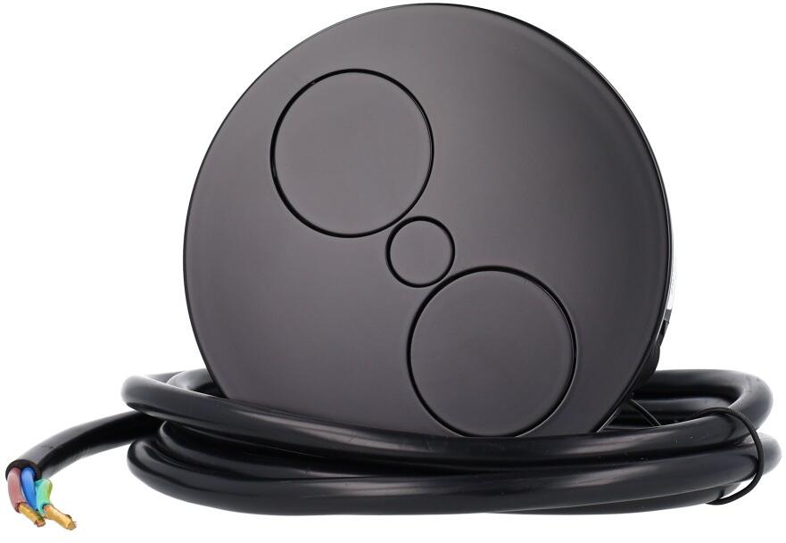 TWIST 2S Deckel in schwarz matt, ähnlich RAL 9005, 30GE seidenmatt wiederanschließbar, 2xSchutzkontaktsteckdosen schwarz mit erhöhtem Berührungsschutz, Zuleitung 2,0m H05VV-F3G1,5mm² schwarz mit Aderendhülsen und beigelegtem Schutzkontakt-Montagezentralstecker schwarz, verpackt im Karton.