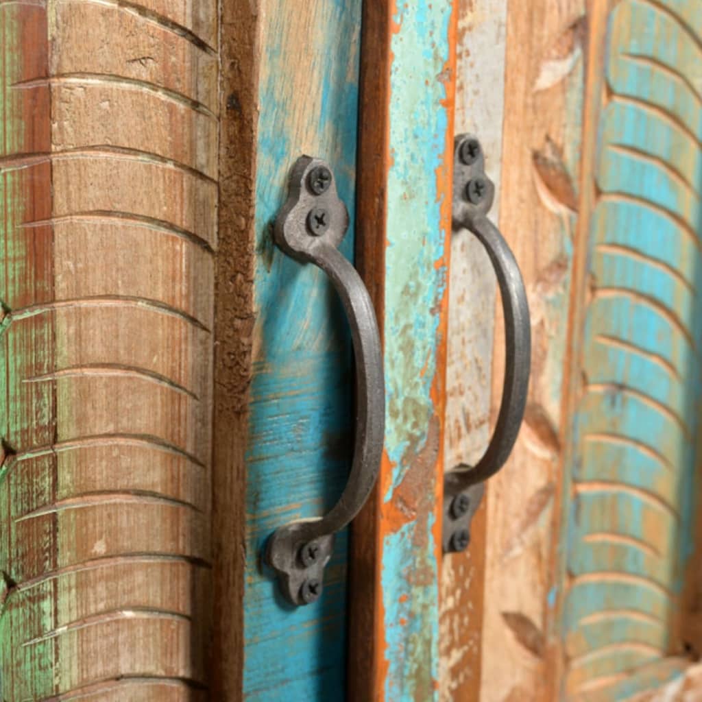Dieses Badmöbel-Set, mit einem Waschbecken-Unterschrank im antiken Stil und einen Spiegel mit Holzrahmen, wird überall ein Hingucker sein.Der Waschbecken-Unterschrank hat eine Höhe von 60 cm und 2 Regale im Innern. Er hat auch einen Loch auf der stabilen Oberfäche, die für das Waschbecken bestimmt ist. Der Spiegel mit buntem Muster ist selten und ist eine wunderbare Ergänzung zu Ihrem Badezimmer. Der Unterschrank und der Rahmen des Spiegels sind aus recyceltem Holz gefertigt, was bedeutet, dass jedes Möbelstück einzigartig ist und von anderen Möbelstücken leicht abweicht. Das aus wiederverwertetem Holz hergestellte Möbel besitzt Eigenschaften der verschiedenen Hölzer, wie Teakholz, Akazie, Mangoholz, Salbaum usw. Der wiederverwertete Holz ist robust, stabil, dauerhaft und schön. Die Nagellöcher oder die deutlichen Maserungen führen ihre Geschichte mit sich und laden eine andere Generation, ihre Geschichte zu durchdringen. Bringen Sie dieses schöne Möbelset nach Hause, in dem sich Ressourcenschonung, Umweltschutz und nachhaltige Entwicklung wunderbar miteinander vereinen lassen. Außerdem, echte Handwerkskunst fügt diesem Set einen spektakulären Vintage-Stil bei und verleiht einen Hauch Exotik. Jeder Prozess der Rekombination, Polieren, Lackieren und Wachsen ist sorgfältig vorbereitet. Dieses Möbelset im antiken Stil wird bestimmt eine perfekte Ergänzung zu Ihrem Haus sein! Im Lieferumfang sind 1 x Spiegel und 1 x Waschbecken-Unterschrank enthalten. Wichtiger Hinweis: Das Waschbecken ist nicht enthalten. Die Farbgebung variiert von Stück zu Stück, so dass jedes unserer Möbelstücke einzigartig ist. Die Lieferung erfolgt beliebig.