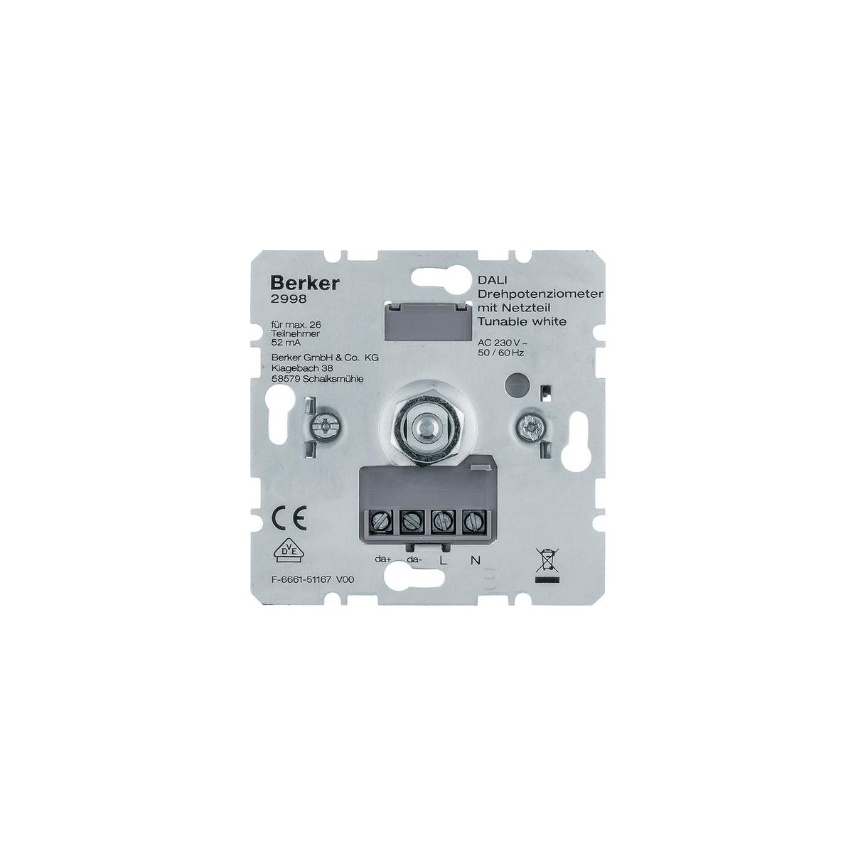 DALI Drehpotenziometer Tunable white mit Netzteil, Softrastung, Lichtsteuerung. DALI Drehpotenziometer Tunable white mit Softrastung, Einschalthelligkeit netzausfallsicher speicherbar, Grundhelligkeit einstellbar (z. B. für Leuchtstofflampen und NV-Halogenlampen), Regelung erfolgt mittels Zentral-Telegramm (Broadcast), kurzschlussfest und überlastsicher (elektronische Sicherung), mit Druck-Ausschalter, mit Schraubklemmen.