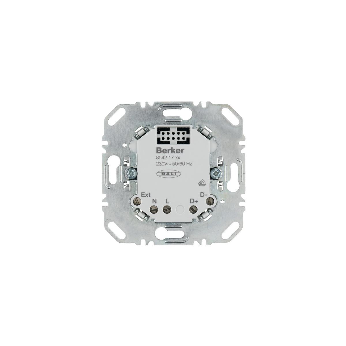 DALI/DSI Steuereinsatz UP mit integriertem Netzteil. DALI/DSI Steuereinsatz UP für DALI Bus-Kommunikation im Broadcast-Modus nach IEC 62386-102, niedriger Eigenenergiebedarf, automatische Erkennung von DALI-/DSI-Geräten, Fernbedienung mit KNX-Funk Handsendern/Wandsendern in Kombination mit KNX-Funk Tasten, Einschalthelligkeit netzausfallsicher speicherbar, automatische Auswahl des Betriebsmodus (aktiv/passiv), liefert bei angeschlossener Netzspannung die Systemspannung für weitere DALI-Teilnehmer, mit Nebenstelleneingang für Taster (Schließer), Steuerinformationen werden zentral an alle Teilnehmer, mit elektronischem Kurzschluss- und Überlastschutz, zum Schalten und Steuern von EVG und Tronic-Trafo mit DALI/DSI-Schnittstelle, keine leitende Verbindung zwischen Tragring und Spreizkrallen, mit Schraubklemmen. Nicht für die Kombination mit anderen DALI-Steuerungen geeignet.