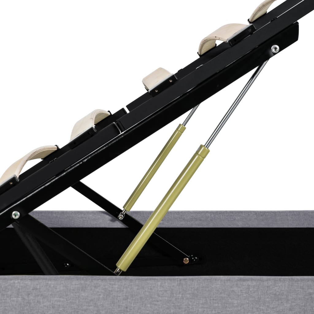 Verleihe deinem Schlafzimmer mit diesem hydraulischen Bettgestell aus Stoff sofort ein beeindruckendes und modernes Aussehen! Dieses Doppelbett zeichnet sich durch ein schlichtes und zugleich stilvolles Design sowie einer soliden Konstruktion aus, da es aus starkem und robustem MDF gefertigt ist. Dieses Polsterbett verwandelt den ungenutzten Raum unter der Matratze in einen Stauraum mit viel Platz zur Aufbewahrung von Kleidung, Laken, Decken usw. Der hydraulische Gashebemechanismus macht das Anheben der Matratze zum Kinderspiel. Der Lattenrost steht nach dem Anheben aufrecht, sodass du beide Hände frei hast, um darunter liegende Gegenstände zu entfernen oder zu verstauen. Der Bettrahmen aus pulverbeschichtetem Stahl und die Latten aus Sperrholz verleihen dem Bett zusätzliche Robustheit und Langlebigkeit. Mit einem Bezug aus glänzendem Kunstleder versehen, wirkt dieses Bett mit Bettkasten einladend und ist pflegeleicht. Dieses Boxspringbett ist für eine Matratze von 120 x 200 cm ausgelegt. Zudem kannst du mit der mitgelieferten 24-Tasten-Fernbedienung bequem die Leistung, die Helligkeit und die verschiedenen Lichtfarben der LED-Beleuchtung einstellen, um eine atemberaubende Atmosphäre zu erzeugen. Dieses Produkt ist einfach zu montieren. Bitte beachte, dass im Lieferumfang nur das Bettgestell enthalten ist. Eine Matratze ist nicht im Lieferumfang enthalten. In unserem Shop findest du die passenden Matratzen. Hinweis: Das Produkt verfügt über einen USB-Anschluss, aber die zertifizierte 5-V-USB-Stromquelle ist nicht im Lieferumfang enthalten.