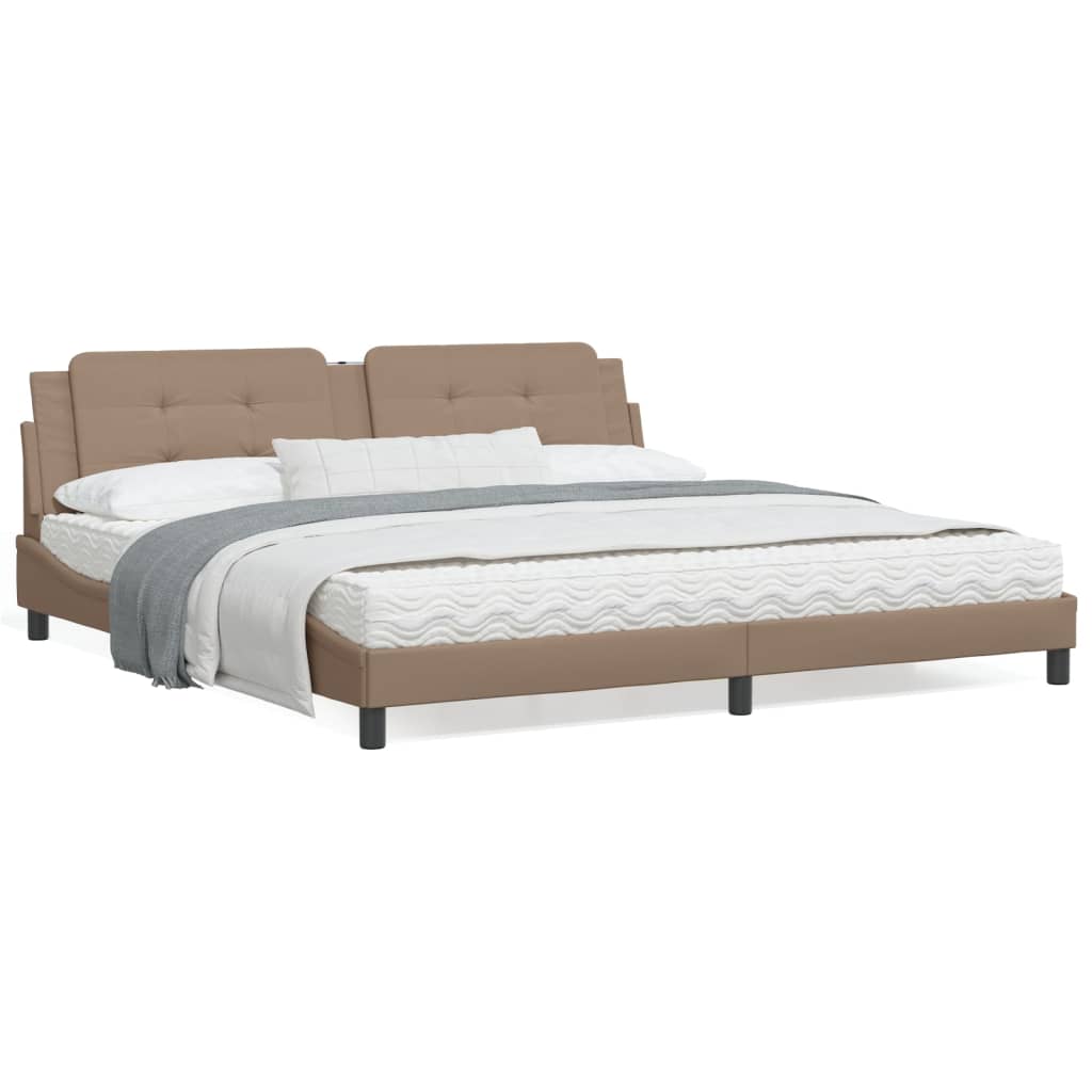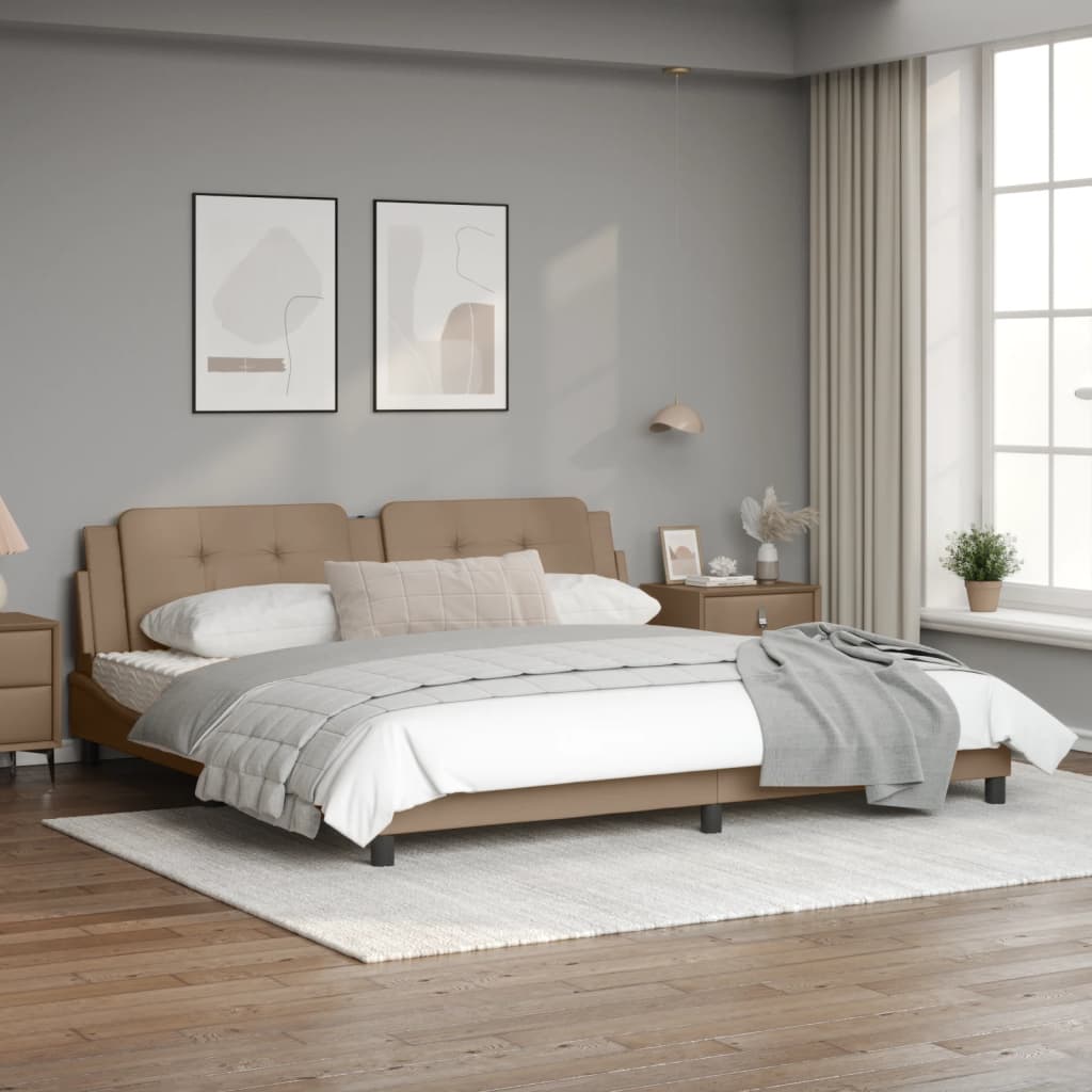 Dieses Bettgestell mit LED-Leuchten sorgt für eine erholsame Nachtruhe! Es stellt eine einladende Ergänzung zu jedem Schlafzimmer dar. Langlebiges Kunstleder: Hochwertiges Kunstleder ist ein äußerst langlebiges Material. Es ist schmutzabweisend und lässt sich mit einem feuchten Tuch einfach reinigen. Durch die glatte Oberfläche weist es die Schönheit von Echtleder und einen luxuriösen Look auf.Sperrholzlatten: Die Sperrholzlatten sorgen für eine gute Gewichtsverteilung und auch dafür, dass die Matratze bei jeder Bewegung deines Körpers während des Schlafes an Ort und Stelle bleibt.Hervorragende Unterstützung: Das Bett-Kopfteil bietet dir eine hervorragende Unterstützung, während du im Bett sitzt, um zu lesen oder fernzusehen.Bunter LED-Streifen: Die farbenfrohen LED-Leuchten bringen das Schlafzimmer zum Leuchten! Die Klettverschlüsse auf der Rückseite des Kopfteils können zur Befestigung der LED-Leuchten verwendet werden.Wellenförmiges Seitendesign: Das stilvolle und raffinierte Design in Wellenform verleiht deiner Einrichtung eine moderne und elegante Note und macht das Bettgestell zum Mittelpunkt deines Schlafzimmers. Gut zu wissen:Bei diesem Bett ist keine Matratze im Lieferumfang enthalten. Wir bieten jedoch eine große Auswahl an Matratzen an. Du kannst in unserem Shop nach einer passenden Matratze suchen.Das Produkt verfügt über einen USB-Anschluss, für den eine zertifizierte 5V-USB-Stromquelle erforderlich ist (nicht im Lieferumfang enthalten).