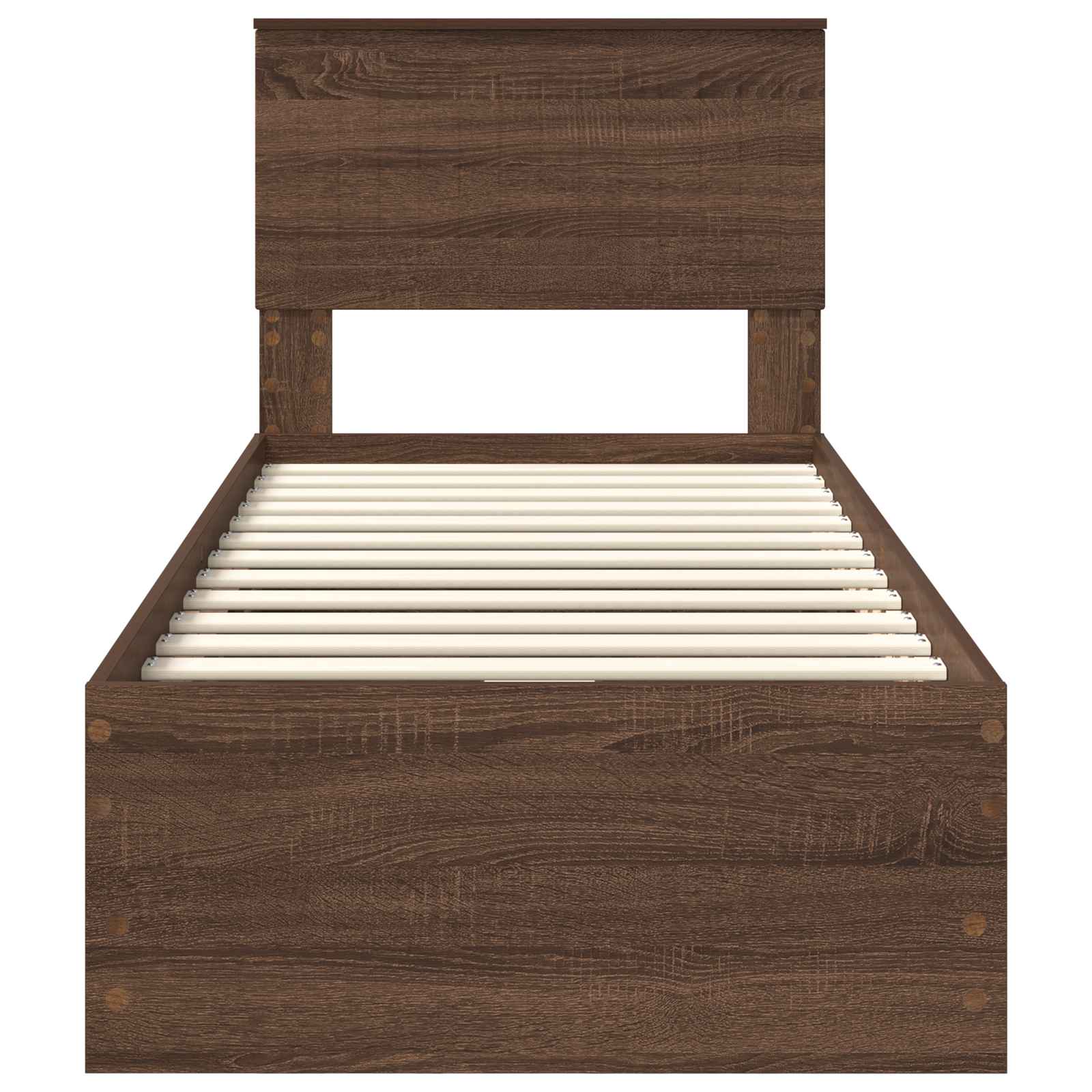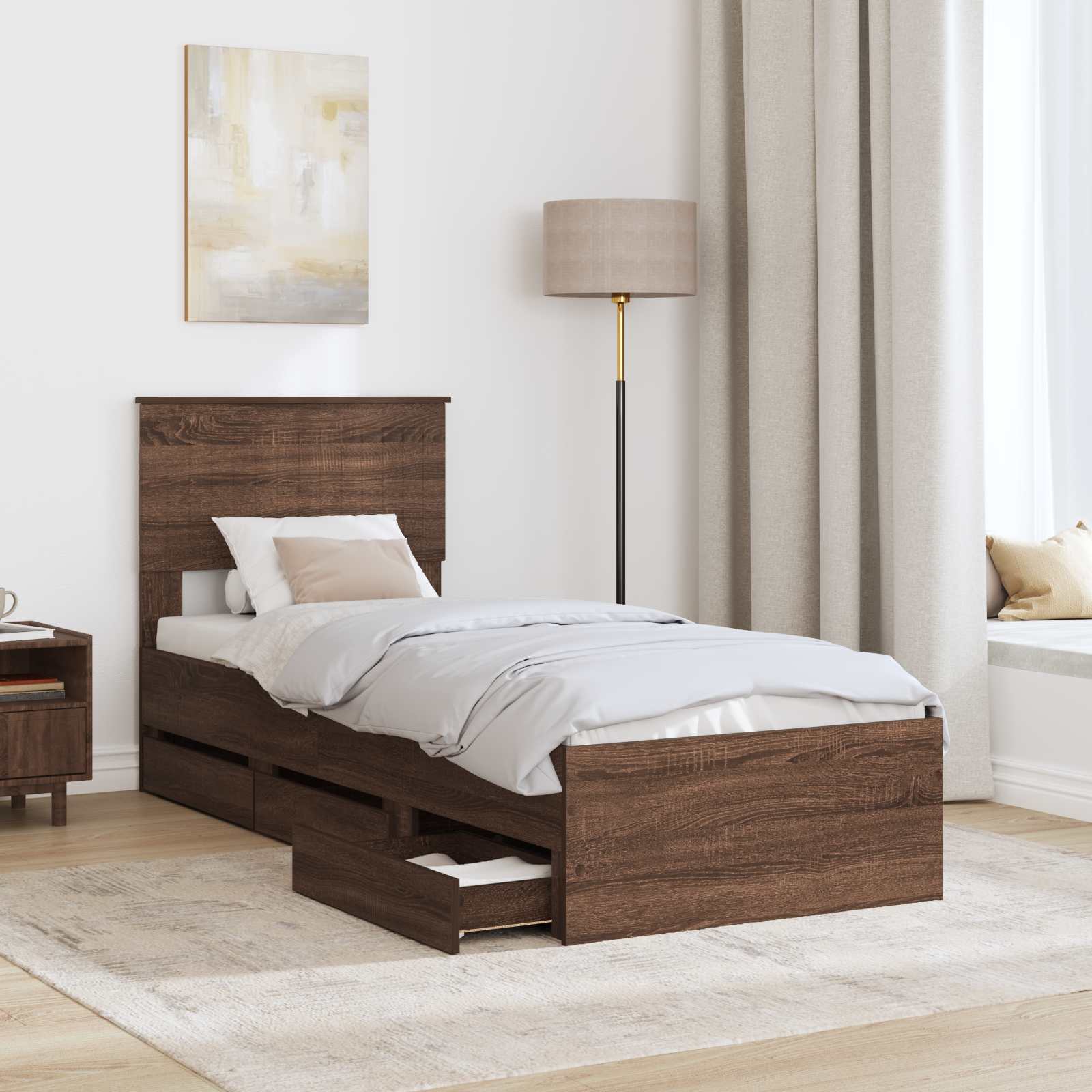 Dieser moderne Bettrahmen kombiniert Stil mit Funktion und ist eine coole Ergänzung für jedes Schlafzimmer. Er begeistert mit klaren Linien und wenig Schnickschnack und passt super zu verschiedenen Geschmackrichtungen. Perfekt für die, die einen frischen und modernen Look wollen, ist der Bettrahmen wie eine Leinwand für kreative Bettwäsche, egal ob mutig oder zurückhaltend. Holzwerkstoffe: Unser Bettrahmen besteht aus starken Holzwerkstoffen, die sogar in stark genutzten Räumen gut gegen Abnutzung bestehen. Das Material sieht nicht nur toll aus, sondern bietet auch eine stabile Basis für guten Schlaf. Versteckte Stauraumlösungen: Er hat clevere Schubladen, die helfen, dein Zimmer ordentlich zu halten. Diese Fächer sind perfekt für alle, die auf gutes Aussehen und praktische Lösungen wert legen und helfen dabei, die Funktionalität des Bettrahmens zu verbessern. Einfache slatted Rahmen: Der Rahmen hat ein festes slatted Design mit Holzlatten, die super Unterstützung bieten. So ist der Rahmen eine tolle Basis für Matratzen und sorgt für gute Luftzirkulation, damit dein Schlaf frisch bleibt. Stabilitätsdesign: Die stabilen, quadratischen Beine bieten sicheren Halt. Ihr modernes Design passt perfekt zum minimalistischen Look des Bettes und verbessert die Stabilität ohne Kompromisse beim Stil. Pflegeleicht: Einfach mit einem feuchten Tuch abwischen, um ihn in Top-Zustand zu halten. Dieses Möbelstück macht die Pflege leicht und sorgt dafür, dass seine Eleganz auch über die Zeit bleibt.