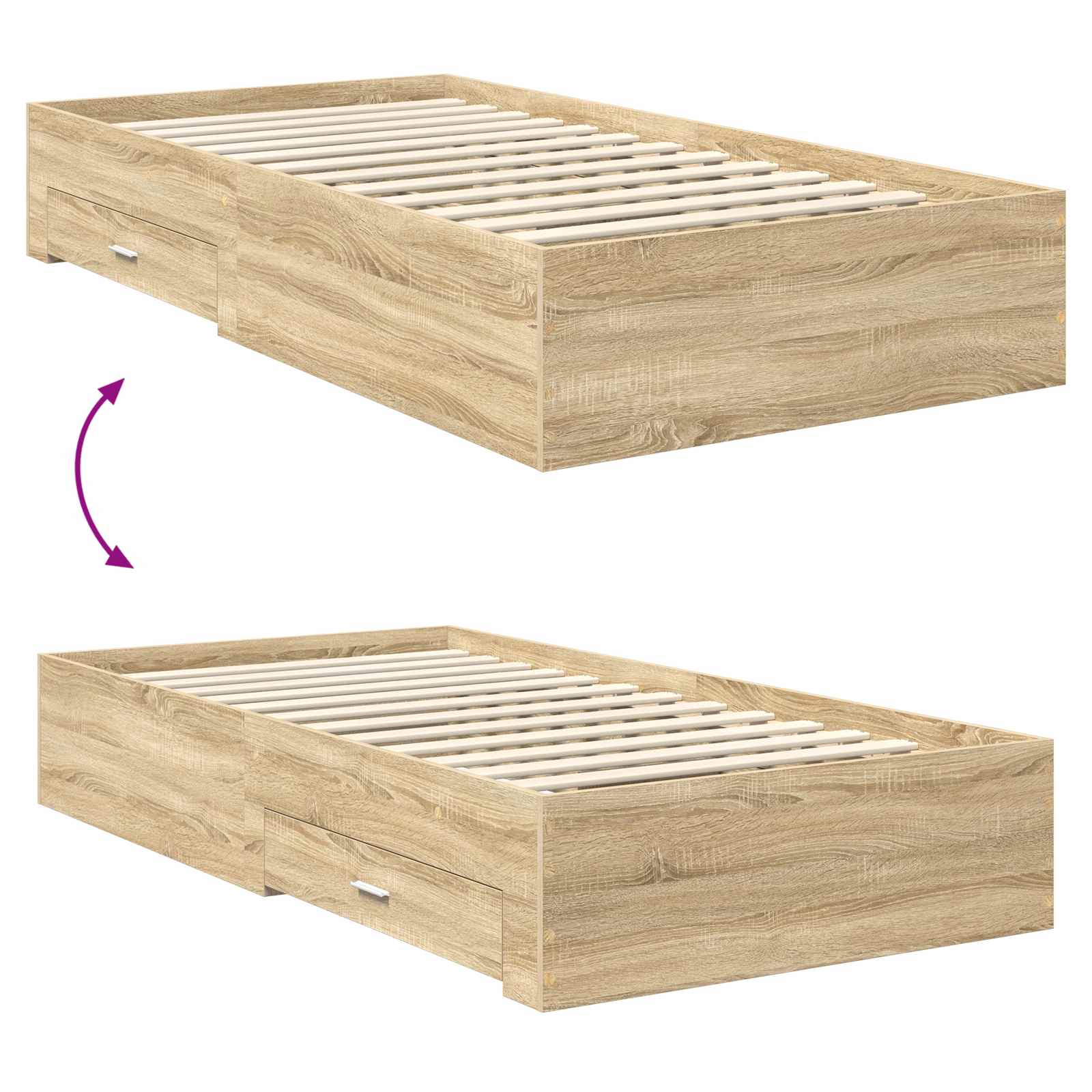 Dieses moderne Bettgestell mit Stauraum bringt frischen Wind in dein Schlafzimmer. Es kombiniert Stil und Funktionalität auf eine super elegante Art. Das schlichte Design mit seinen klaren Linien und minimalistischen Formen passt perfekt zu jedem modernen Einrichtungsstil und macht es zu einer flexiblen Wahl für jedes Schlafzimmer. Konstruierte Holzwerkstoffbauweise Das Bettgestell aus hochwertigem engineered wood ist stabil und langlebig. Das Material wurde wegen seiner Widerstandsfähigkeit gewählt, sodass du lange Freude daran hast. Es bietet die perfekte Mischung aus Stil und Funktionalität, die auch über die Jahre frisch bleibt. Integrierte Stauraumlösungen Das Bett hat praktischen Stauraum, ideal für Bettwäsche, Kleidung oder persönliche Dinge, die ordentlich verstaut werden. So wird der Platz im Schlafzimmer optimal genutzt und es eignet sich super für kleinere Räume. Modernes Kopfteil Das Kopfteil aus engineered wood ergänzt das Design und verleiht dem Bett einen coolen Look. Es ist bequem, egal ob du liegst und liest oder entspannt, und erhöht den Komfort und die Funktionalität. Effizientes Design Mit einer Höhe von 32 cm ist dieses Bett einfach zu montieren und zu reinigen. Es benötigt nur einen Schraubendreher und zwei Personen, was den Aufbau einfach und schnell macht. Einfache Wartung Die Pflege des Bettgestells ist durch die abwischbare Oberfläche aus engineered wood super easy. Ein feuchtes Tuch reicht aus, um es sauber zu halten, sodass das Bettgestell immer gut aussieht.