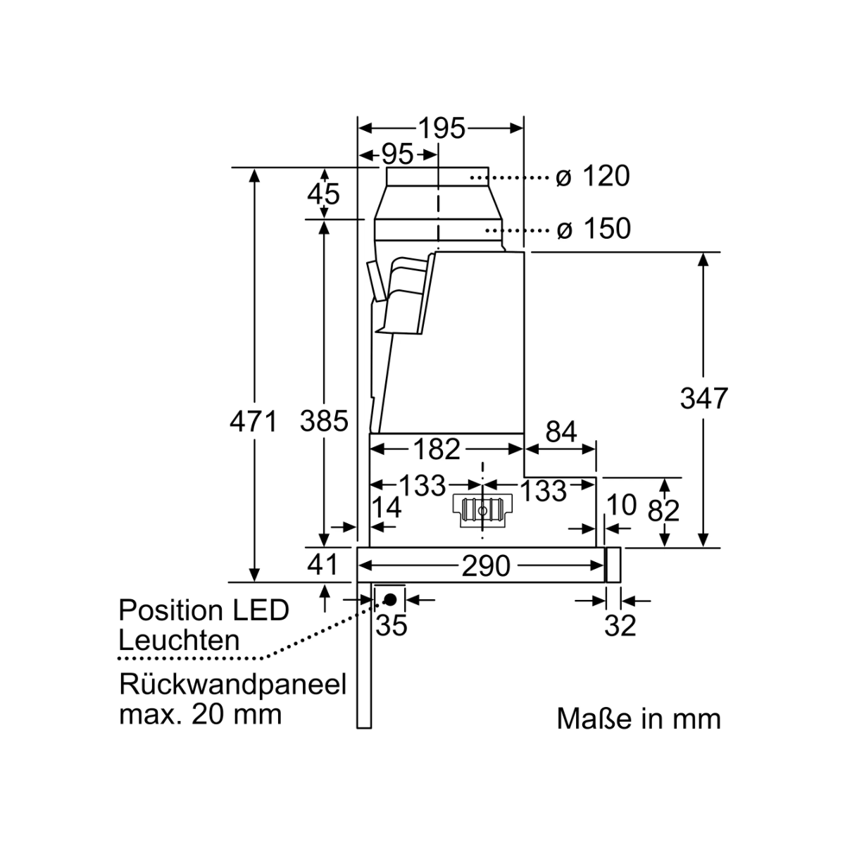 - Abluftstutzen Ø150mm (Ø120mm beiliegend)