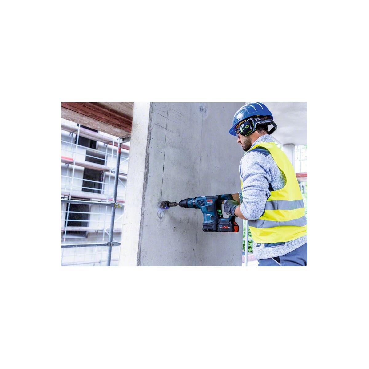 Akku-Bohrhammer BITURBO mit SDS max GBH 18V-36 C, Der GBH 18V-36 C Professional kombiniert extrem kompakte Bauweise mit großer Leistungsstärke für anspruchsvolle Arbeiten in Beton. Mit einem geringen Gewicht von nur 6,1 kg ist er wesentlich kompakter und leichter gebaut als jeder andere Akku-Hammer mit SDS max auf dem Markt. Die BITURBO Brushless-Technologie des Hammers bietet ein hervorragendes Leistungspotenzial von maximal 7,0 J. Das Gerät ist mit allen Bosch Professional 18-Volt-Akkus und -Ladegeräten kompatibel (Professional 18V System). Für maximale Leistung: ProCORE18V = 8,0 Ah. Er verfügt über ein User Interface mit Bluetooth Connectivity für den Werkzeugstatus in Echtzeit und über unterschiedliche Werkzeugmodi sowie über neue elektronische Funktionen wie den Sanftanlauf beim Bohren und Meißeln und eine Schalterarretierung beim Meißeln, was ihn zum intelligentesten Hammer auf dem Markt macht 1 x Bluetooth Low Energy Modul GCY 42 Professional (1 600 A01 3WF); Zusatzhandgriff (2 608 000 702); Maschinentuch (ET-Nr. 1 619 200 413); Fetttube (ET-Nr. 1 615 430 010); Handwerkerkoffer (ET-Nr. 1 605 438 1G2)