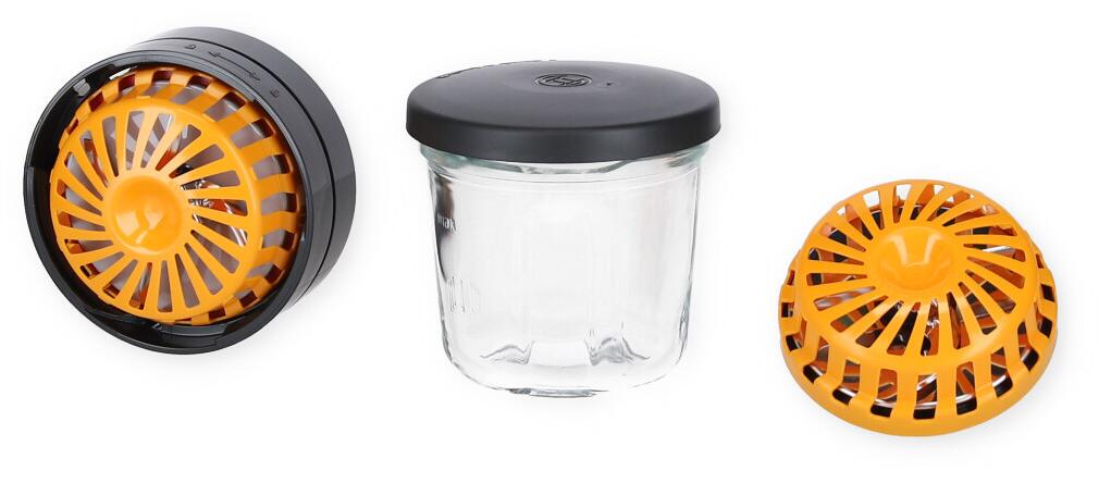 - Das Glasgefäß kann mit einem Deckel verschlossen werden, um verarbeitete Lebensmittel aufzubewahren.