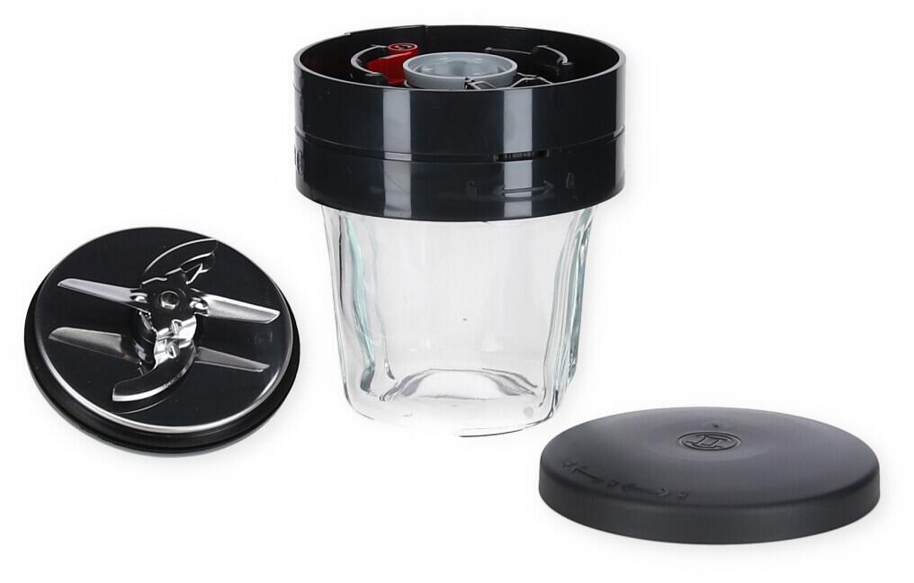 - Integriertes Zubehör 2 x Messer-Schutzkappe, 1 x Glas mit Aufbewahrungsdeckel, 1 x Hack- / Mixmesser, 1 x Mahlmesser