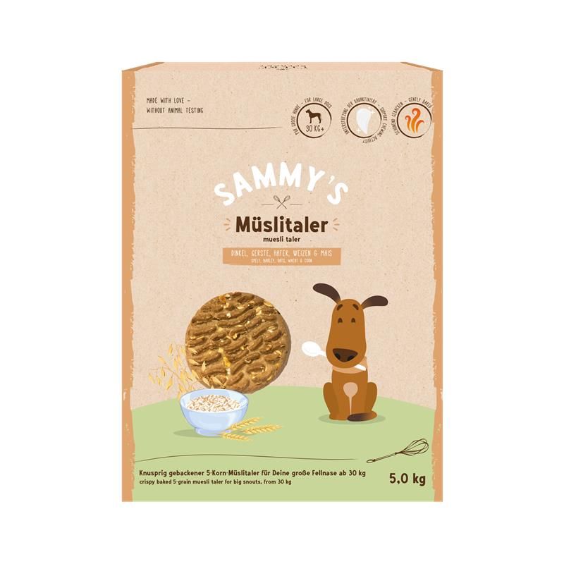 Sammys MüslitalerKnusprig gebackener 5-Korn-Müslitaler für Deine große Fellnase ab 30 kg Knackiges Vollkorn, vollmundiger Mais, kräftiges Weizen- und Dinkelmehl und zarte Haferflocken sind Sammys Zutaten für seinen Müslitaler. Die hochwertige 5-Korn-Mischung wird in alter Backtradition behutsam verknetet und schonend im Ofen gebacken. Unverwechselbar mit der goldbraunen Kruste ist unser 5-Korn-Müslitaler besonders hart und knusprig, damit Deine große Fellnase auch morgen noch kraftvoll zubeißen kann. 0 % zugesetzter Zucker - 100 % Müsligenuss. Schmeckt auch Zwischendurch. Zusammensetzung: Weizenmehl, Vollkorn-Gerste (14 %), Haferflocken (14 %), Geflügelprotein (getrocknet), Dinkel (4,5 %), Maisflocken (4 %), Weizenflocken (4 %), Geflügelfett, Mineralstoffe, Bierhefe (getrocknet). Analytische Bestandteile:19,00 % Protein, 7,00 % Fettgehalt, 2,00 % Rohfaser, 5,6 % Rohasche.Zusatzstoffe:5.000 I.E. Vitamin A, 500 I.E. Vitamin D3, 75 mg Vitamin E, 20 mg Zink (als Zinkoxid), 7 mg Kupfer (als Kupfer(II)-sulfat-Pentahydrat).Technologische Zusatzstoffe: Antioxidationsmittel.Idealgewicht des Hundes Snacks pro Woche 2,5 - 15 kg 0,5 - 3 15 - 30 kg 3 - 5 30 - 40 kg 5 - 6 40 - 50 kg 6 - 8 50 - 60 kg 8 - 9Bitte berücksichtigen Sie die Zugabe von Snacks bei der Gesamt-Tagesration Ihres Hundes.Diese Angaben sind Richtwerte. Der individuelle Bedarf hängt von Faktoren wie Alter, Rasse, Aktivität und Haltungsbedingungen ab. Trinken ist wichtig! Bitte stets frisches Wasser bereitstellen.Bitte kühl und trocken lagern. Nicht in der Nähe von Reinigungsmitteln, Arzneimitteln und anderen scharf riechenden Sachen lagern!Inverkehrbringer: bosch Tiernahrung GmbH & Co. KG, Engelhardshauser Str. 55+57, 74572 Blaufelden-Wiesenbach, Tel.: 07953/870, E-Mail: info@bosch-tiernahrung.de