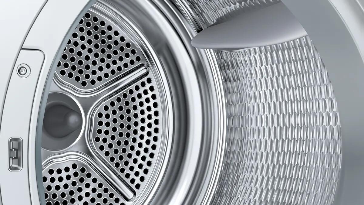 - Sensitive Drying System: große Edelstahltrommel, Mitnehmer im Softdesign