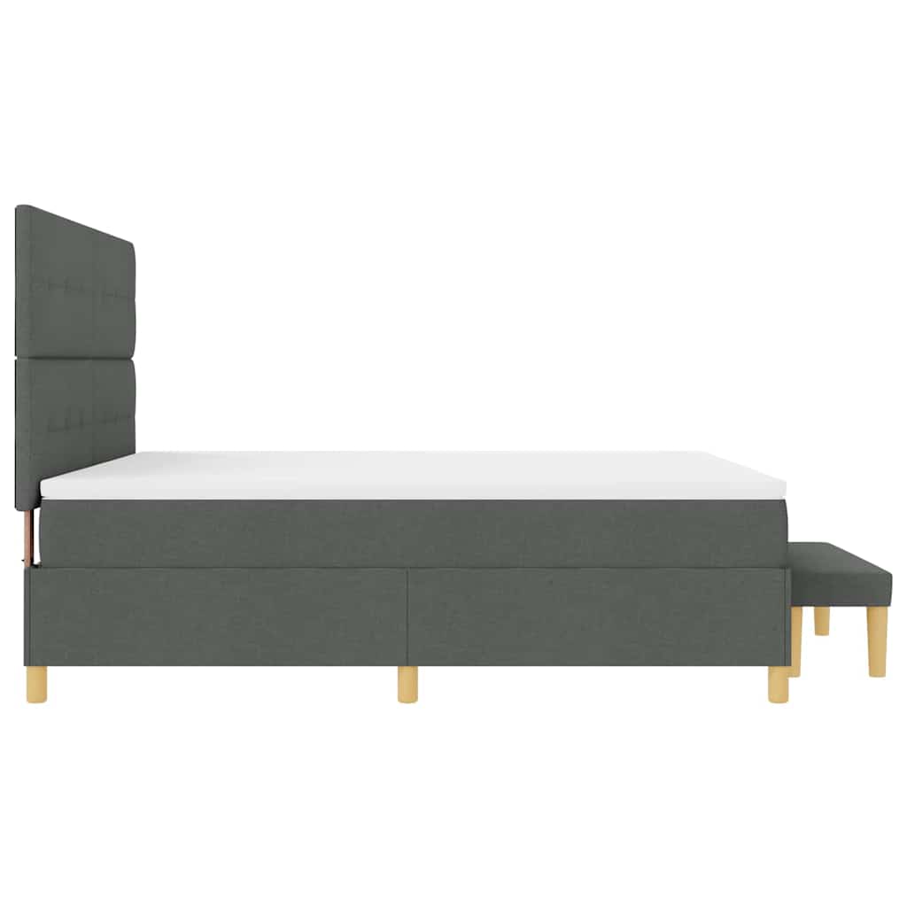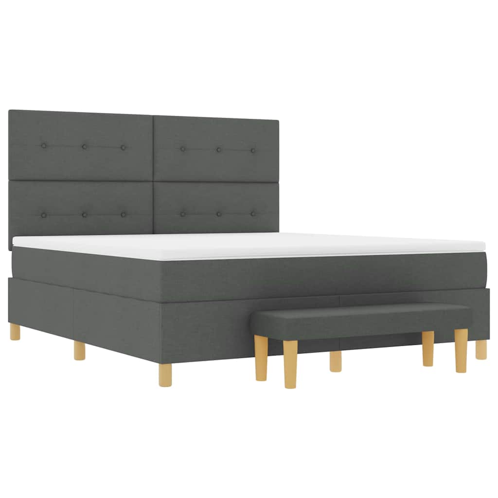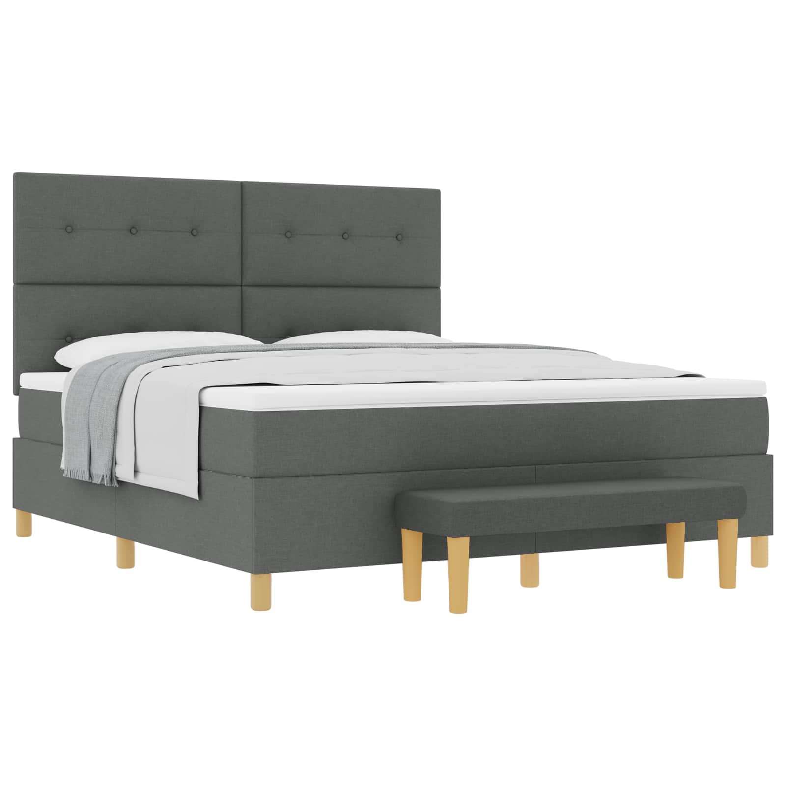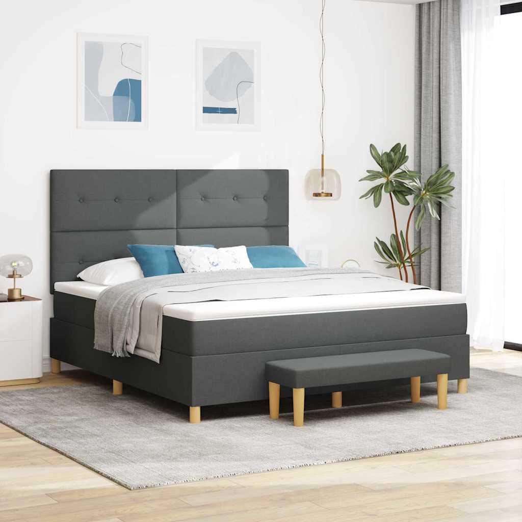 Dieses Boxspringbett kombiniert Komfort und Stil und ist eine klasse Wahl, wenn du dein Schlafzimmer aufpeppen willst. Mit seinem angesagten dunkelgrauen Stoff und dem stabilen Holzrahmen ist es mehr als nur ein Bett ? es wird zum stilvollen Highlight, das Eleganz in jeden Raum bringt und Platz für zwei Erwachsene bietet. Bequemer Schlaf: Die Matratze und die obere Schaumstoffschicht bieten dir hervorragenden Halt und sorgen für eine erholsame Nachtruhe. Zudem ist es leicht genug, um es zu bewegen, was es anpassungsfähig für deinen Raum macht. Robuste Bauweise: Hergestellt aus einem stabilen Holzrahmen, ist dieses Bett langlebig. Du kannst dich entspannen, denn es ist für den täglichen Gebrauch konzipiert. Modernes Aussehen: Der dunkelgraue Stoffbezug bringt einen eleganten und frischen Look in dein Zuhause. Kombiniere es mit deiner Lieblingsbettwäsche für einen warmen und einladenden Schlafbereich. Praktische Bank: Die Bank kann sowohl als Sitzgelegenheit als auch cleverer Stauraum für Bettzeug oder persönliche Sachen genutzt werden, was sie praktisch für jedes Schlafzimmer macht. Leicht zu reinigen: Der fleckenresistente Stoff macht die Reinigung super einfach und hilft dir, dein Bett mit minimalem Aufwand schick aussehen zu lassen.