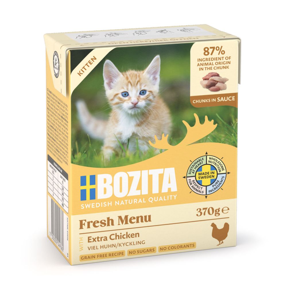 Hier ist alles drin, was kleine Kätzchen glücklich, gesund und stark machtZum Beispiel leicht verdauliches Fleisch von Hühnchen und Lachs. Oder der präbiotische Ballaststoff FOS, der die Darmflora im Gleichgewicht hält und die empfindlichen Mägen der jungen Katzen schützt. Aber auch das, was nicht drin ist, sollte an dieser Stelle aufgezählt werden: Fett zum Beispiel ist in diesem Leckerbissen mit 5% nur spärlich vertreten. Und auf Füllstoffe wie Zucker, Soja und Konservierungsstoffe wurde – wie bei allen Bozita Produkten – komplett verzichtet. Der beste Start in ein rundum gesundes Leben!Zusammensetzung:Huhn* (68% im Stück), Lachs* (7,2% im Stück), Schwein*, Rind*, Calciumcarbonat, Zichorieninulin (FOS 0,1%), Hefe* (ß-1,3/1,6-Glucan 0,01%). *Natürliche Inhaltsstoffe.Analytische Bestandteile:Proteine 7,5%, Fettgehalt 5%, Rohfaser 0,5%, Rohasche (Mineralstoffe) 2% (davon Calcium 0,35%, Phosphor 0,3% und Magnesium 0,02%), Feuchtigkeit 83%. Umsetzbare Energie:330 kJ/100g.M20Zusatzstoffe (pro kg)Ernährungsphysiologische Zusatzstoffe: Vitamin A 2000IE, Vitamin D3 200IE, Vitamin E 12mg, Taurin 770mg, Kupfer (Kupfer(II)sulfat, Pentahydrat) 2mg; Mangan (Mangan(II)oxid) 1,4mg; Zink (Zinksulfat, Monohydrat) 14mg; Jod (Calciumiodat, Anhydrat) 0,1mg.Fütterungsempfehlung:Gewicht der Katze in kg Tagesration in Gramm 1 130 2 200 3 260 4 320Sterile Verpackung. Geöffnete Verpackung bei maximal + 8°C lagern und innerhalb von 2 Tagen aufbrauchen. Mindesthaltbarkeitsdatum: Siehe Stempel.Alleinfuttermittel für Katzen.Inverkehrbringer: Bozita GmbH, Osterfeldstraße 12-14, 22529 Hamburg, Tel.: 040/39895780, E-Mail: info@bozita.com