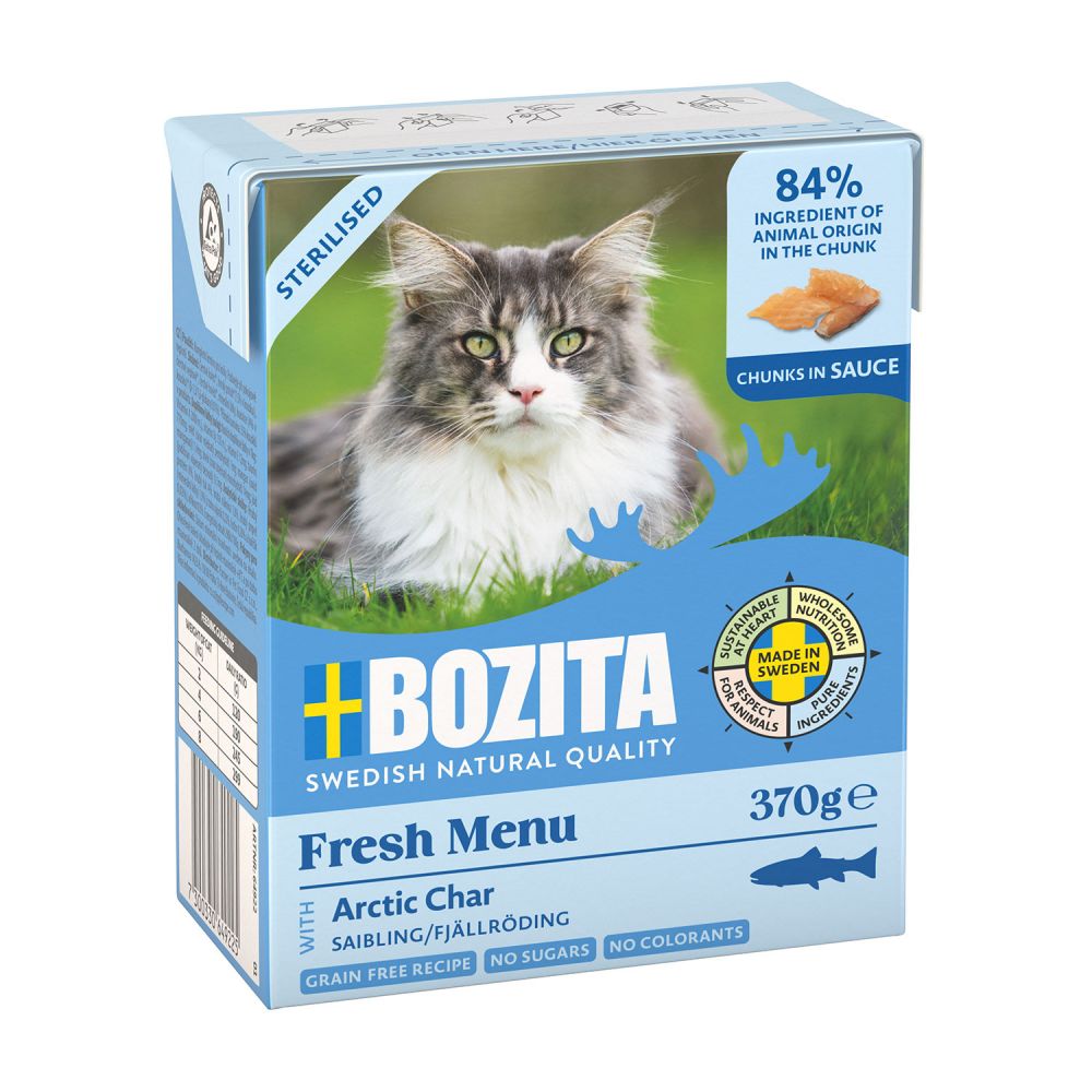 Saftige Häppchen in Soße mit Eismeer-Saibling: Das klingt nach einer Leckerei aus dem Schlaraffenland für Katzen. Der mit nur 4 % geringe Fettanteil macht dieses „Sterilised“-Futter zur ersten Wahl für erwachsene Tiere mit niedrigem Energiebedarf. Es ist damit ideal für sterilisierte, ältere oder sehr ruhige Hauskatzen. Ein Blick auf die Zutatenliste und in strahlende Katzenaugen verrät, dass feinster Geschmack im Pflichtenheft für die getreidefreie Rezeptur ganz vorn stand. Die getreidefreie Rezeptur besticht durch frische tierische Zutaten, der hohe Fleischanteil sorgt für einen optimalen Gehalt an Nährstoffen und Vitaminen. Frischer Eismeer-Saibling sorgt für ein Extra an Geschmack und gesunder Ernährung. Der Saibling ist ein leicht verdaulicher Lachsfisch, der aus den wilden Gewässern Skandinaviens stammt. Er gilt als ausgezeichnete Eiweißquelle und ist zudem reich gesegnet mit Vitamin D und vielen essenziellen Omega-3-Fettsäuren, die Herz-Kreislauf-Krankheiten vorbeugen. Die Qualitätsrezeptur enthält 8 % tierisches Protein und ist selbstverständlich frei von Soja, Getreide und Konservierungsstoffen. Auf den Zusatz von Zucker und unnötigen Zusatzstoffen wird konsequent verzichtet. Angereichert ist diese Köstlichkeit mit dem Beta-Glucan MacroGard®, das die Produktion weißer Blutkörperchen anstößt und damit das Immunsystem ihres Stubentigers stärkt. Taurin und der ausgewogene Vitamin- und Mineralstoffgehalt tragen ihren Teil dazu bei. Nachhaltig verpackt in umweltfreundlichen, einfach zu öffnende und wiederverschließbaren Tetra Recarts zu je 370 g. Jede Bestelleinheit umfasst 6 Tetra Recarts. Zusammensetzung:Frisches Huhn*, frisches Schwein*, frisches Rind*, frischer Saibling* (7,5 % im Häppchen), Lignocellulose (4 % im Häppchen)*,Mineralien, Zichorie Inulin (0,1 %, eine Quelle für FOS), Hefe (ß-1,3/1,6-Glucan 0,01 %). *Natürliche Inhaltsstoffe. 55 % Häppchen im Produkt.Analytische Bestandteile:Protein 8 %, Fettgehalt 4 %, Rohfaser 1,8 %, Rohasche 1,9 % (davon Calcium 0,24 %, Phosphor 0,22 % und Magnesium 0,02 %), Feuchtigkeit 83 %. Umsetzbare Energie:290kJ/100g.Zusatzstoffe (pro kg)Ernährungsphysiologische Zusatzstoffe: Vitamin A 2000IE, Vitamin D3 150IE, Vitamin E 12mg, Taurin 770mg, Kupfer (Kupfer(II)sulfat, Pentahydrat) 1mg, Mangan (Mangan(II)oxid) 1,4mg, Zink (Zinksulfat, Monohydrat) 14mg, Jod (Calciumiodat, Anhydrat) 0,1mg.Fütterungsempfehlung:Gewicht der Katze (kg) Tagesbedarf (g) 2 120 4 190 6 245 8 299Bei den angegebenen Mengen in der Dosierungstabelle handelt es sich nur um Richtwerte. Der Bedarf ist sehr individuell und wird von der Aktivität und dem Alter der Katze beeinflusst. Die Futtermenge sollte daher den jeweiligen Bedürfnissen und dem Befinden der Katze angepasst werden. Die Katze muss stets Zugang zu Frischwasser haben.Anwendung: Servierfertiges Alleinfutter für Katzen aller Lebensphasen. Lagerung: Vollkonserve. Geöffnete Verpackung kühl aufbewahren (höchstens +8°C) und innerhalb von 2 Tagen aufbrauchen.Alleinfuttermittel für Katzen.Inverkehrbringer: Bozita GmbH, Osterfeldstraße 12-14, 22529 Hamburg, Tel.: 040/39895780, E-Mail: info@bozita.com