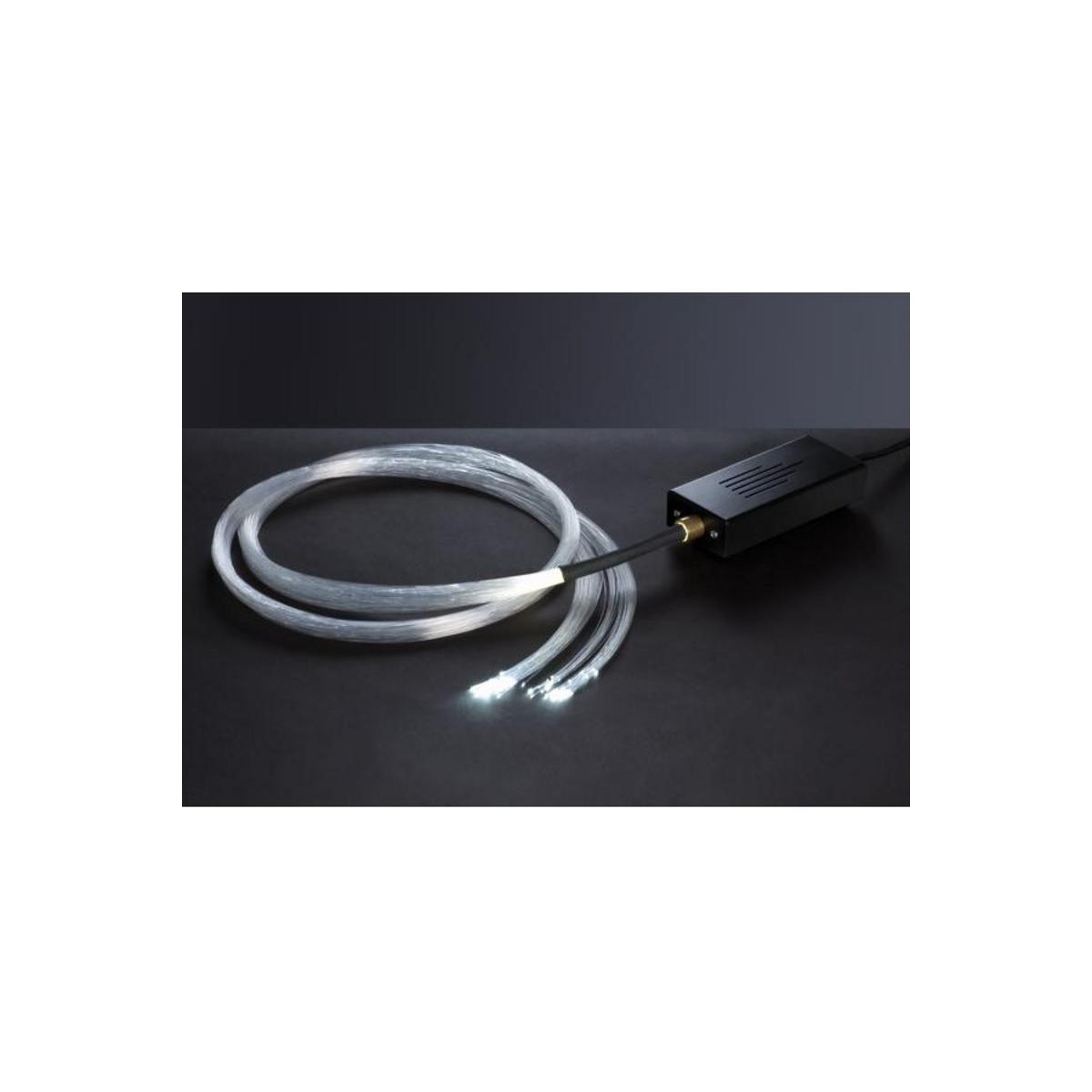 LED-Sternenhimmel-Set. Bestehend aus: 1 x Projektor - 1 W Power-LED (L 180 x B 65 x H 35 mm) 1 x Faserbündel konfektioniert 100-teilig (Länge: je 1.500 mm): 30 x Ø 0,5 mm 40 x Ø 0,75 mm 20 x Ø 1,0 mm 10 x Ø 1,5 mm inkl. 1.500 mm Anschlussleitung mit Schukostecker inkl. Konverter zum Anschluss an 230 V-Netzspannung ohne Lüfter (somit keine Geräuschentwicklung) Das Set ist für eine Fläche von ca. 2-3 m² ausgelegt.