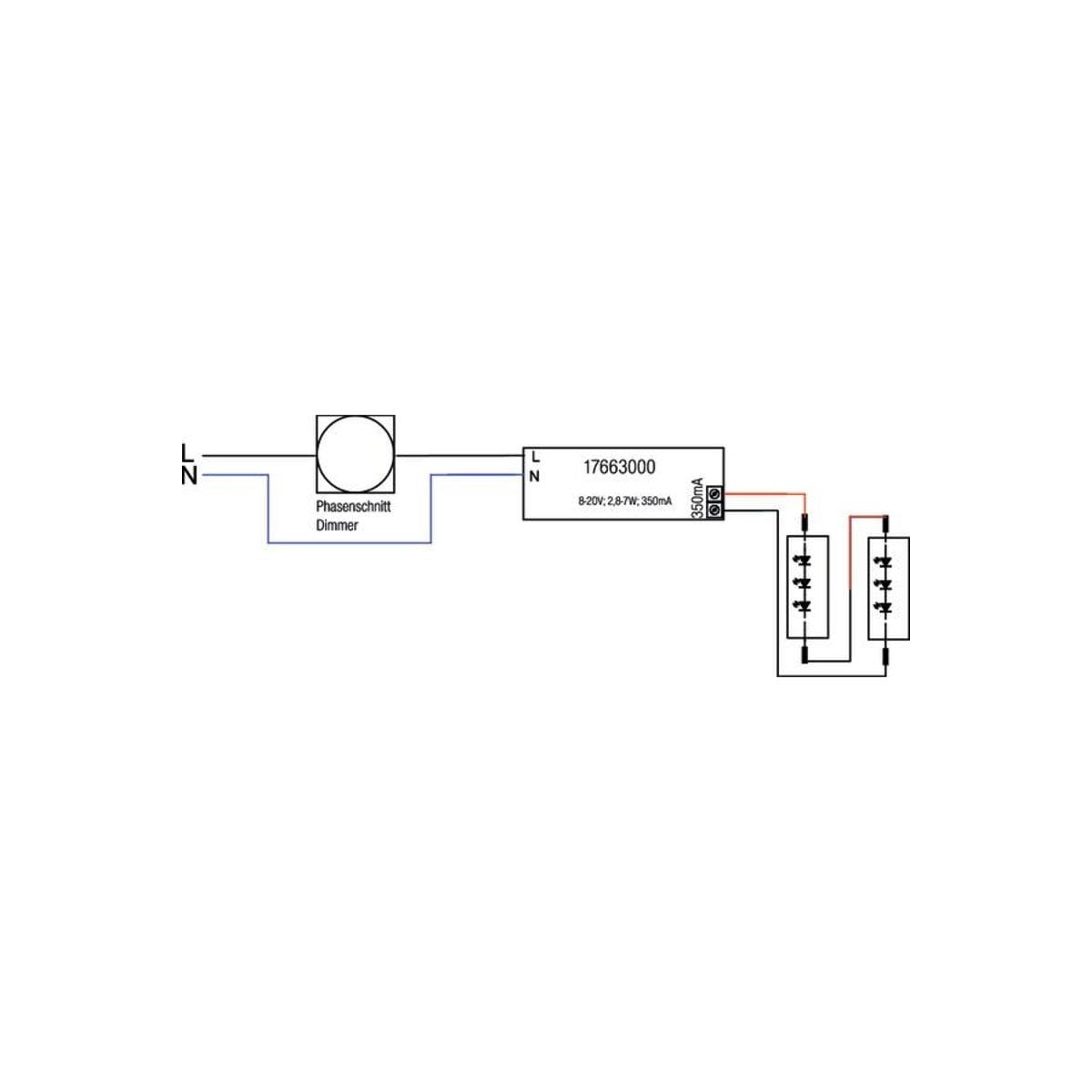 LED-Konverter 350 mA, Phasenabschnitt dimmbar. Dieser Konverter ist durch Sicherungseinrichtungen gegen Überspannung und Kurzschluss sowie thermische und elektrische Überlastung geschützt. Die Eingangs- und die Ausgangsklemme ist für Leitungen mit einem Querschnitt von bis zu 1,5 mm² geeignet.