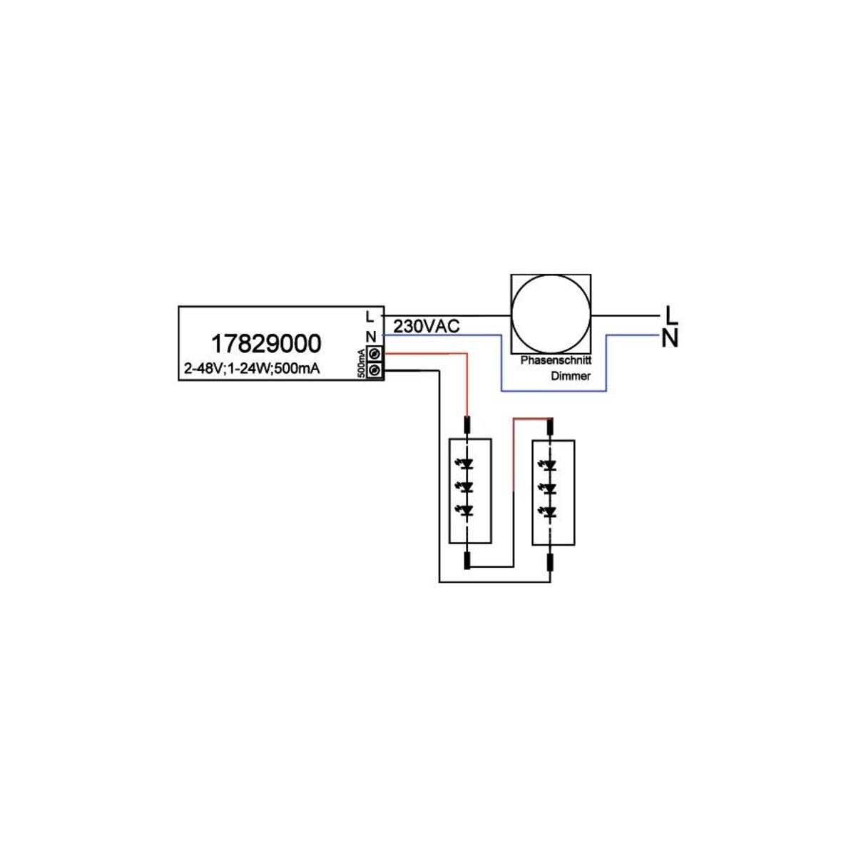 LED-Konverter 500 mA, Phasenabschnitt dimmbar. Dieses Betriebsgerät erfüllt die Anforderungen für Sicherheitsbeleuchtungsanlagen nach DIN EN 50172 VDE 0108-100:2005-01. Dieser Konverter ist durch Sicherungseinrichtungen gegen Überspannung und Kurzschluss sowie thermische und elektrische Überlastung geschützt. Die Eingangs- und die Ausgangsklemme ist für Leitungen mit einem Querschnitt von bis zu 2,5 mm² geeignet.