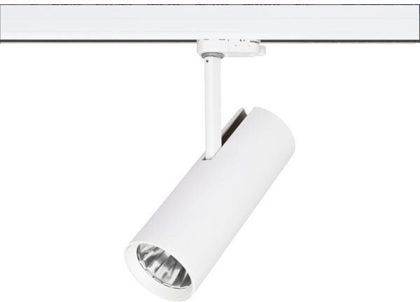 LED-Schienenstrahler, dreh- und schwenkbar, schaltbar, strukturweiß, rund. Ausführung in kompakter Bauform für die harmonische Implementierung in stimmige, architektonische Raumkonzepte. Wärmeableitung: passiv (ohne Lüfter), Inkl. Betriebsgerät, schaltbar, (230 V AC 50 Hz). Leuchte inkl. Euro-Adapter für Standard-3-Phasen-Schienen. Ausführung: ohne Fassung, Montageart: Anbaumontage, Montageort: Deckenmontage, Material: Aluminium, Schutzart raumseitig: nach DIN EN 60529: IP20, Schutzklasse: (EN 61140) I, Spannung: 230V AC 50Hz, Leistung: 23 W, Anzahl der Leuchtmittel / Fassungen: 1 Stück, Lichtstrom: 2.880 lm, Farbtemperatur: 3.000 K, Lichtfarbe: weiß, Abstrahlwinkel: 36°, Verstellbarkeit: drehbar und kopfverstellbar, Mit Betriebsgerät: Ja, Art der Dimmung: schaltbar.