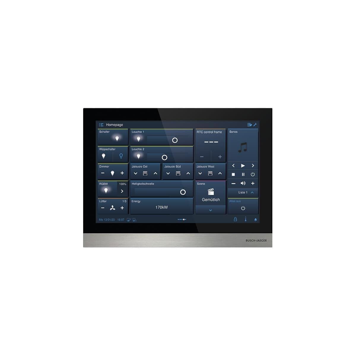 - Zur zentralen Steuerung von bis zu 100 konfigurierbaren Busch-free@home® oder Busch-Installationbus® KNX Funktionen vom Typ: Schalten, Dimmen, Jalousie, RTR, Szene, Philips HUE.