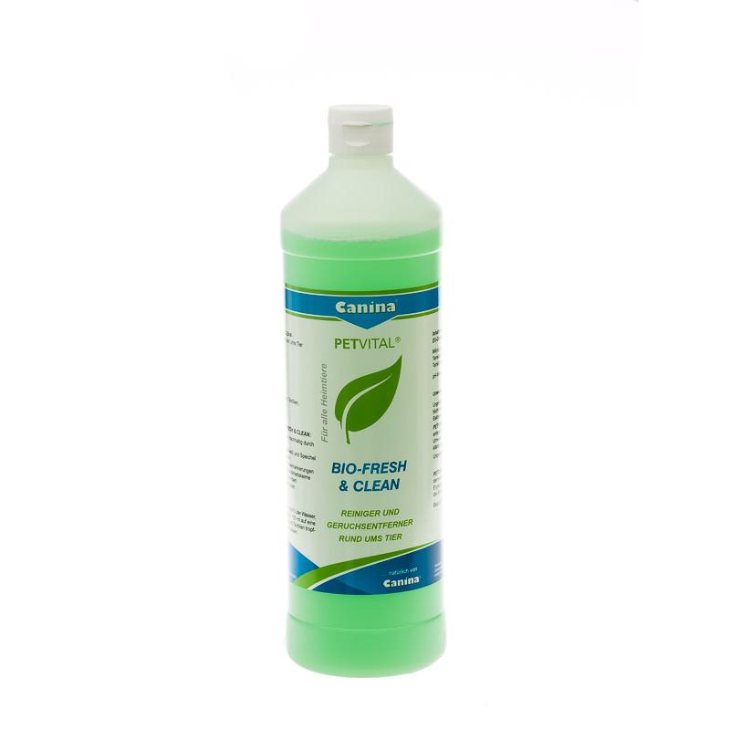 Reinigt effektiv und entfernt nachhaltig unangenehme Gerüche rund ums Tier ! Spezielle Mikroorganismen zersetzen nachhaltig geruchsbildende Rückstände wie z.B. Urin, Kotwasser, und Analdrüsensekret, so dass Gerüche nicht nur überdeckt sondern regelrecht vernichtet werden. Organische Verunreinigungen mit unangenehmer Geruchsentwicklung werden auf natürliche Weise beseitigt. Petvital Bio Fresh & Clean wurde dermatologisch mit dem Ergebnis SEHR GUT getestet, fällt nicht unter die Biozidrichtlinien und ist völlig unschädlich für Mensch, Tier und Umwelt! Typische Anwendungsbereiche sind: - Liegeplätze - Zwinger und Gehege – Katzentoiletten – Hundekörbchen – Frettchengehege - Nager- und Vogelkäfige sowie Volieren – Praxisräume - Haushalt: Räume, Polstermöbel, Teppiche, Textilien - u.v.m. Das kann Petvital Bio Fresh & Clean: - Es reinigt und entfernt Gerüche aller Art nachhaltig und umweltschonend durch Mikroorganismen - Urin, Kot, Dung, Schweiß und Speichel werden geruchsfrei abgebaut - Entfernt stark riechende Reviermarkierungen - Baut Nährböden für Krankheitskeime ab - Vermindert starken Fliegenbefall - Beseitigt unangenehme Gerüche in AbflüssenInhalt: 1000ml Inhaltsstoffe: Nach EU-Detergenzienverordnung: Mikroorganismen Kl.1, Anionische Tenside unter 1%, Duftstoffe ph-Wert ca. 7.Anwendung: Vor Gebrauch schütteln. 100ml auf 5l Wasser, nass wischen, nicht nachspülen. 100ml auf eine 1l Sprühflasche, Flächen und Textilien tropfnass einsprühen und trocknen lassen. Umweltverhalten: Ungefährlich für Mensch, Tier und Umwelt. Nicht toxisch, nicht sensibilisierend. Die Bakterien sind nicht pathogen. Petvital Bio Fresh & Clean entsprechend der Grundlage für Umweltzeichen RAL-UZ 84, kläranlagenverträgliche Sanitärzusätze. Ungefährlich für Wasserlebewesen.Inverkehrbringer: Canina pharma GmbH, Kleinbahnstraße 12, 59069 Hamm, Tel.: 02385/2415, E-Mail: info@canina.de