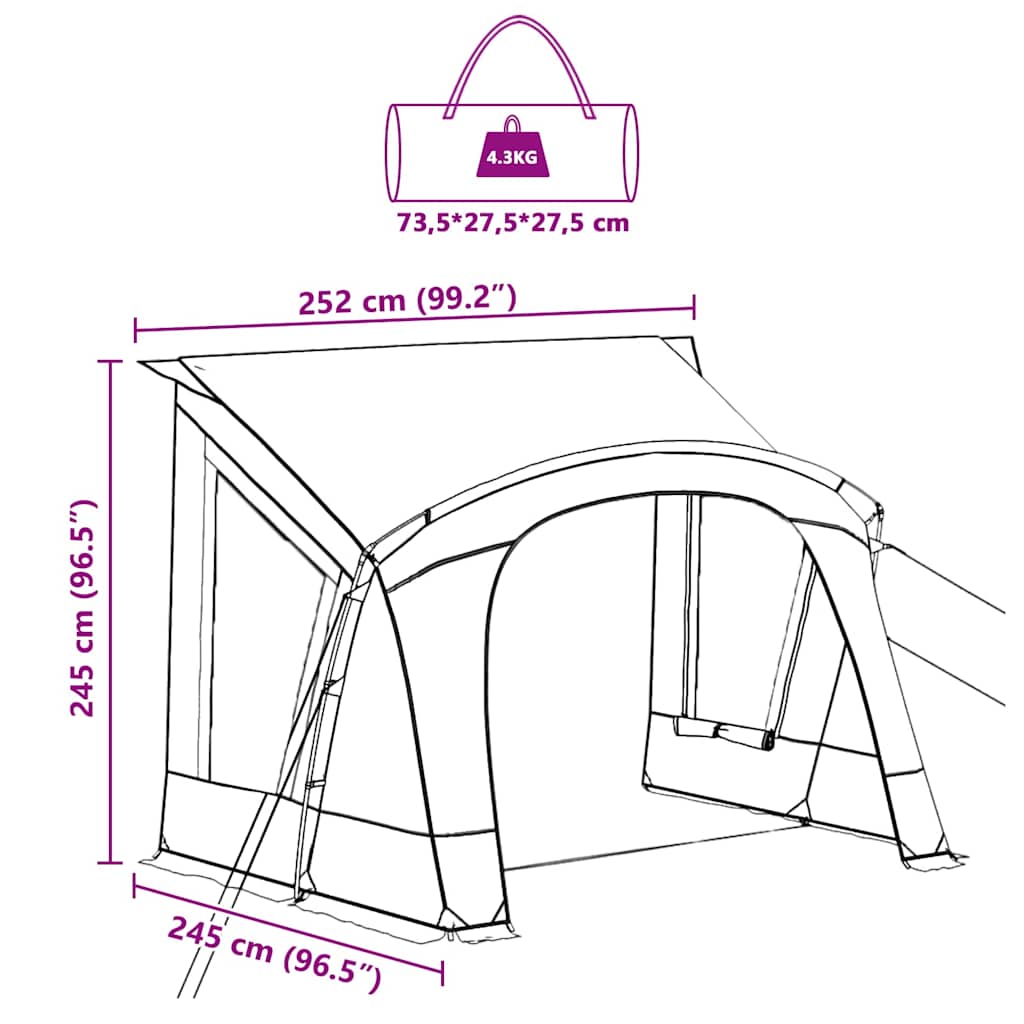Dieses moderne Caravan-Zelt ist für maximalen Komfort entwickelt worden und bietet genug Platz für Gruppen. Es lässt sich einfach einrichten und verstauen. Dank des glatten Taftstoffs und dem stylishen Design fügt es sich perfekt in Gärten und auf Terrassen ein, ideal für Sommer- und Campingabenteuer. Materialien: Das Zelt ist aus glattem Taftstoff gefertigt und sorgt für Stabilität und Wetterfestigkeit. Es ist wasserdicht und UV-beständig, perfekt für die Launen des Sommers, damit du kühl und trocken bleibst. Das moderne Design verleiht deinem Außenbereich einen coolen Look und verbessert dein Camping-Erlebnis. Komponenten: Es kommt mit einem integrierten Rohr für eine unkomplizierte Aufstellung, was Stabilität und einen leichten Aufbau ermöglicht. Die Belüftungsfenster und der Lampenhaken sorgen für gute Luftzirkulation und Licht, sodass du rund um die Uhr bequem wohnen kannst. Design/Funktion: Das Zelt hat ein klappbares Design, das einen erleichterten Transport garantiert. Der schnelle Abbau sorgt für ein kompaktes Verstauen nach der Nutzung, und die tragbare Natur macht es zum perfekten Begleiter für jedes Outdoor-Abenteuer. Anwendungen: Es eignet sich super für den Garten, die Terrasse und zum Campen. Das offene Design begrüßt Sonnenlicht und frische Luft, ideal für Ausflüge, Treffen oder einfach zum Entspannen ? perfekt für tolle Zeiten mit Freunden und Familie. Pflege: Halte das Zelt in gutem Zustand, indem du es mit kaltem Wasser abspülst. Lagere es an einem kühlen, trockenen Ort, damit es länger hält. So bleibt das Zelt ein zuverlässiger Unterschlupf für jede Campingsaison und behält seine Funktionalität und sein Aussehen.