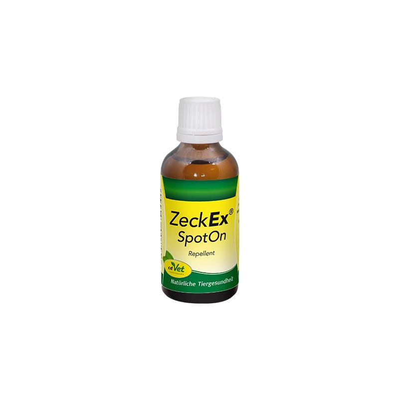ZeckEx SpotOn* ist die pflanzliche Alternative zu den chemischen Repellentien.Hervorragender Langzeitschutz für alle Wirbeltiere.Auch für Katzen und Junghunde geeignet.Zusätzlicher Schutz vor Flöhen, Milben, Haarlingen und fliegenden Insekten wie Stechmücken und Bremsen.Enthält rein pflanzliche Inhaltsstoffe.Einfach in der Anwendung.Zusammensetzung:Schwarzkümmelöl, Jojobaöl, Lavendelöl, Manukaöl. Wirkstoff: Eucalyptus citriodora Öl hydratisiert, zyklisiert (EC Öl )H/C)) 100 mg/L; BAuA Reg.-Nr.: N-84838Ursprung des Wirkstoffes aus den Blättern des Zitroneneukalyptus.Anwendung:Über 3 Wochen.Kleine Hunde und Katzen: 2 x pro Woche,mittlere Hunde: jeden zweiten Tag,große Hunde: täglich je 1 Tropfen auf den Finger geben und in beide Ohrzapfen einmassieren oder je einen Tropfen auf den Finger geben und zwischen den Schulterblättern und am Rutenansatz (direkt auf der Haut) einmassieren.Ist die Grundstabilisierung erreicht, genügt eine Anwendung je nach Körpergewicht von 1 - 2 mal wöchentlich. Bei starker regionaler Zeckenbelastung kann die Anwendung individuell auf 4 - 5 mal angepasst werden.ZeckEx SpotOn* ist bei Regen und dem Baden in Gewässern grundsätzlich wasserfest. Nach dem Shampoonieren sollte es jedoch erneut aufgetragen werden. Biozid Produkte vorsichtig verwenden. Vor Gebrauch stets Etikett und Produktinformationen lesen. Bitte informieren Sie sich über Biozid-Mittel mittels der vom Hersteller optional bereitgestellten Datenblätter.Biozid-Produkt Registernummer/ Zulassungsnummer für Deutschland: N-85125Inverkehrbringer: cd Vet Naturprodukte GmbH, Industriestraße 9 - 11, 49584 Fürstenau, Tel.: 05901/97960, E-Mail: info@cdvet.de