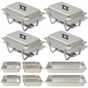 Dieses praktische Set aus 4 Chafing Dishes hält Speisen über einen längeren Zeitraum hinweg warm. Es ist ideal für den Einsatz bei professionellen Caterings sowie in der Gastronomie, aber auf Partys oder Familientreffen im privaten Umfeld geeignet. Das Chafing-Dish-Set aus hochwertigem Edelstahl ist solide verarbeitet und pflegeleicht. Die Speisenbehälter haben die üblichen "Gastronorm"-Maße und ermöglichen damit einen universellen Einsatz sowie vielfältige Kombinationsmöglichkeiten. Die abgerundeten Ecken in Wasserbecken und Speisenbehälter erleichtern die Reinigung. Die Deckel haben einen wärmeisolierenden Griff und können für eine einfache Handhabung auf den praktischen Deckelhalter am Gestell platziert werden. Mit 2 Tragegriffen an den Gestellen sind die Speisenwärmer leicht zu bewegen. Zwei Brennpastenbehälter pro Gestell halten Ihre Speisen über lange Zeit warm.
