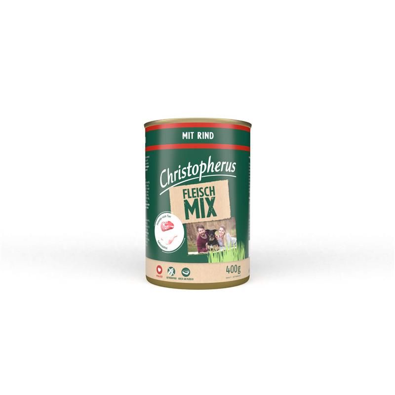 Der Christopherus Fleischmix mit Rind wird mit frischem Fleisch und Innereien von Rind und Huhn hergestellt. Die ausgewählten hochwertigen Rohstoffe und die schonende Zubereitung machen sie leicht verdaulich, wohlschmeckend und gesund. Auf den Zusatz von pflanzlichen Eiweißextrakten (Soja) sowie Farb-, Aroma- und Konservierungsstoffen verzichten wir bewusst.Zusammensetzung:70% Fleisch und Innereien (44% Rind, 26% Huhn), 25,8% Brühe, 2% Erbsenstärke, 1% Lignocellulose, 1% Mineralstoffe, 0,2% Leinöl.Analytische Bestandteile:Rohprotein 8,5%, Rohfett 7%, Rohfaser 0,5%, Rohasche 2,5%, Feuchtigkeit 75%, Calcium 0,4%, Phosphor 0,3%, Natrium 0,2%.Ernährungsphysiologische Zusatzstoffe je kg:Vitamin D3 (3a671) 200 I.E., Vitamin E (3a700) 100 mg, Taurin (3a370) 450 mg, Biotin (3a880) 0,2 mg, Zink (3b606) 12 mg, Eisen (3b106) 10 mg, Mangan (3b504) 2 mg, Kaliumjodid (3b201) 0,7 mg, Kupfer (3b406) 0,5 mg.Technologische Zusatzstoffe je kg:Johannesbrotkernmehl (E410) 5.000 mg.Fütterungsempfehlung:Gewicht des HundesGramm pro Tag 5 - 7,5kg 0270 - 0365g 10 - 15kg 0455 - 0620g 20 - 30kg 0765 - 1040gBitte zimmerwarm füttern. Stellen Sie ausreichend frisches Trinkwasser bereit.Füttern Sie Christopherus Dosennahrung allein, oder in Verbindung mit z.B. Christopherus Trocken- oder Flockennahrung.Bei den angegebenen Fütterungsmengen handelt es sich um Richtwerte, die je nach Alter, Rasse, Konstitution und Aktivität variieren können.Inverkehrbringer: VAFO.de GmbH & Co. KG, Müggenort 21, 27321 Thedinghausen, Tel.: 04233/93200, E-Mail: service@vafo.de