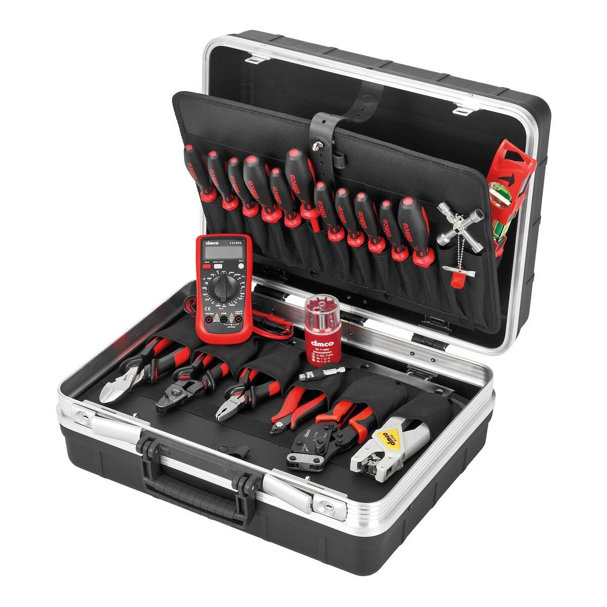 Lehrlingskoffer INDUSTRIE, robuste Werkzeugkoffer aus stoßfestem Kunststoff mit stabilem Aluminiumrahmen mit zwei abschließbaren Kippschlössern. Ausgestattet mit tiefgezogener Bodenschale mit zahlreichen Unterteilungsmöglichkeiten und herausnehmbarer Bodenabdeckplatte, einseitig mit Werkzeugtaschen bestückt. Zudem herausnehmbare Werkzeugtafel mit einer Vielzahl von Werkzeugeinsteckfächern. Größe: LxBxH: 395x455x205 mm, Gewicht: leer 3.450 g, bestückt 9.000 g.