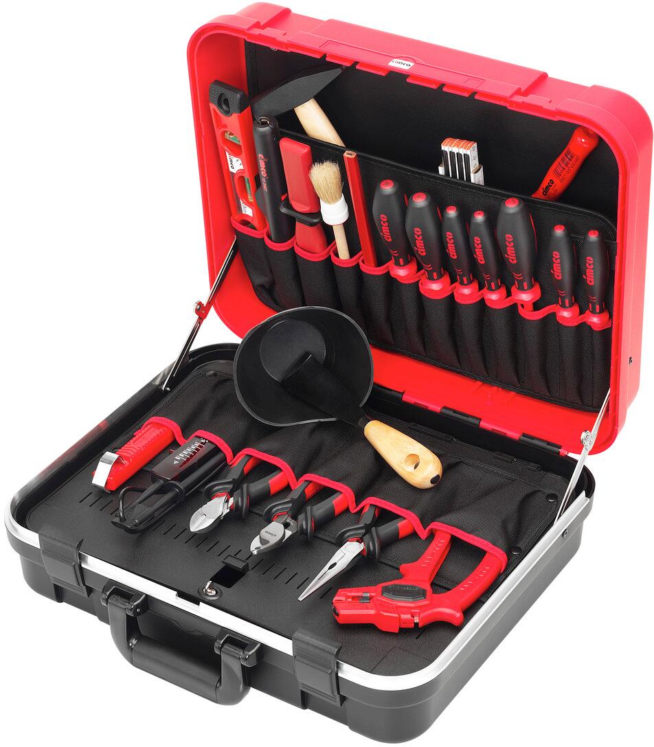 Lehrlingskoffer 2004, komplett mit 23 Werkzeugen, robuster Hartschalen-Werkzeugkoffer für den Profi-Einsatz in attraktivem Zwei-Farben-Design, zwei auswechselbare Kippverschlüsse, zwei verstärkte Metall-Klappscharniere als Deckelhalter, Öffnungswinkel größer 90°, 2 Werkzeugtafeln aus Leichtkunststoff mit zahlreich aufgenähten Einstecktaschen zur Aufnahme von Handwerkzeugen, geräumiges Dokumentenfach ist in der oberen Werkzeugtafel integriert, Bodenschale mit drei Separationen zur Aufbewahrung von Messwerkzeugen, Kleinteilen, Werkzeug, etc., Innenmaße ca. 430x340x155mm, Gewicht leer nur 3200g