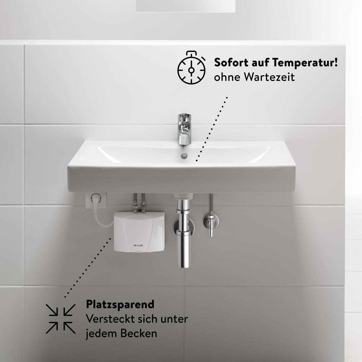 - Hydraulisch gesteuerter Durchlauferhitzer (Untertischgerät) im Miniformat zur energieeffizienten Versorgung eines Waschbeckens, mit druckloser Einhebelmischbatterie