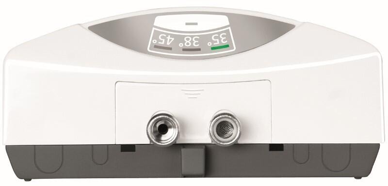 Die Heizleistung wird durch die Elektronik automatisch geregelt. Das sorgt für eine perfekte Warmwassertemperatur, ein Mischen mit kaltem Wasser ist nicht mehr nötig. Der Durchlauferhitzer verfügt über ein Tastenbedienfeld mit farbigen LEDs zur Einstellung der Auslauftemperatur in drei Stufen (35 °C, 38 °C und 45 °C). Er eignet sich zudem zur Nacherwärmung von vorerwärmtem Wasser (z.B. Solaranlage).