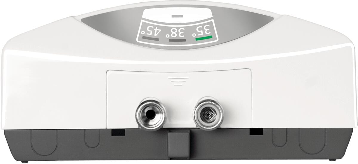 Die Heizleistung wird durch die Elektronik automatisch geregelt. Das sorgt für eine perfekte Warmwassertemperatur, ein Mischen mit kaltem Wasser ist nicht mehr nötig. Der Durchlauferhitzer verfügt über ein Tastenbedienfeld mit farbigen LEDs zur Einstellung der Auslauftemperatur in drei Stufen (35 °C, 38 °C und 45 °C). Er eignet sich zudem zur Nacherwärmung von vorerwärmtem Wasser (z.B. Solaranlage).