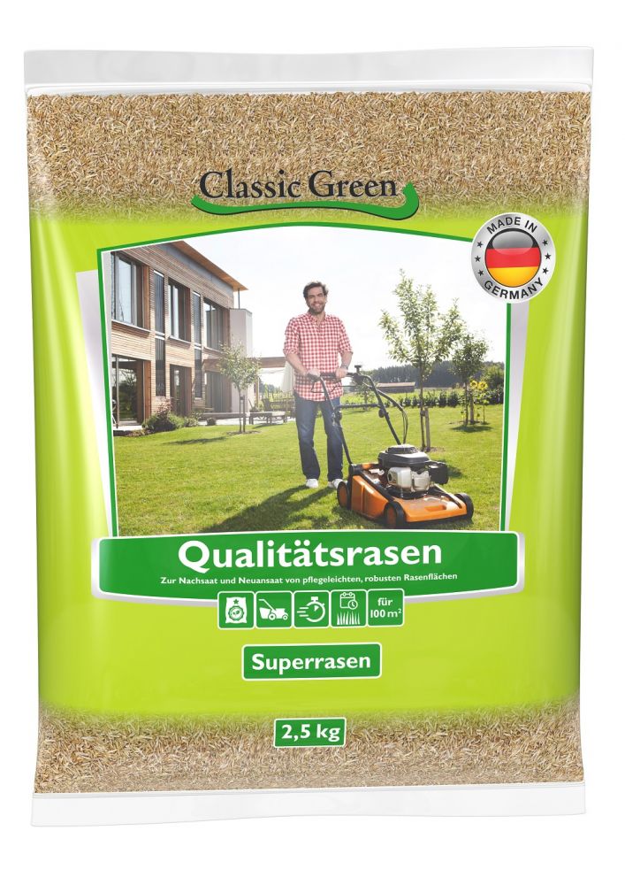Der Classic Green Superrasen ist die ideale Wahl für alle, die einen dichten, grünen und belastbaren Rasen wünschen. Die hochwertige Saatmischung besteht aus speziell ausgewählten Gräsern, die für eine schnelle Keimung, tiefgrüne Farbe und hohe Strapazierfähigkeit sorgen. Egal, ob für den heimischen Garten, Spielrasen oder repräsentative Flächen mit dem Classic Green Superrasen erzielen Sie ein perfektes Ergebnis.Ein schöner, dichter und sattgrüner Rasen ist das Aushängeschild eines jeden Gartens. Mit dem Classic Green Superrasen erhalten Sie eine hochwertige, leistungsstarke Rasenmischung, die sowohl für den Hausgarten als auch für stark beanspruchte Flächen wie Spiel- und Sportrasen geeignet ist.Dank sorgfältig ausgewählter Gräserarten bietet der Classic Green Superrasen eine schnelle Keimung, hohe Trittfestigkeit und eine exzellente Regenerationsfähigkeit. Ob für die Neuanlage oder Nachsaat diese Mischung sorgt für eine dichte, robuste und tiefgrüne Rasenfläche, die selbst bei intensiver Nutzung und wechselhaften Witterungsbedingungen ihre Qualität behält.Produktvorteile auf einen Blick:- Premium-Qualität Enthält eine hochwertige Mischung aus feinblättrigen, robusten und tiefgrünen Gräsern.- Schnelle Keimung Erste Grashalme bereits nach wenigen Tagen sichtbar.- Exzellente Narbendichte Sorgt für eine besonders dichte und widerstandsfähige Grasnarbe.- Tiefgrüne Farbe Sorgt für eine gleichmäßige, ansprechende Optik.- Hohe Belastbarkeit Ideal für Gärten mit spielenden Kindern oder Haustieren.- Selbstregenerierend Durch spezielle Gräsermischungen schließt sich der Rasen schnell bei kleinen Lücken.- Anpassungsfähig Ideal für sonnige sowie halbschattige Lagen.- Pflegeleicht Wächst zuverlässig auch bei wechselhaften Wetterbedingungen. Geringer Pflegeaufwand mit ausgezeichneter Strapazierfähigkeit.- Für Sonne und Halbschatten geeignet Flexibel einsetzbar auf verschiedenen Standorten.- Widerstandsfähig gegen Moos Unkraut Fördert eine gesunde, kräftige Grasnarbe, die Unkraut verdrängt.- Trockenheitsresistent Entwickelt tiefreichende Wurzeln und übersteht auch kurze Trockenperioden.- Einfache Aussaat Leicht zu streuen und für Nachsaaten bestens geeignet.Aussaat- PflegehinweiseAussaatzeit:Optimal von März bis Oktober bei Bodentemperaturen über 10 Grad Celsius.Eine frühzeitige Aussaat im Frühjahr oder Herbst sorgt für die besten Ergebnisse.Keimdauer:In der Regel 7 14 Tage, abhängig von Temperatur und Feuchtigkeit.Während der Keimphase regelmäßig feucht halten.Aussaatmenge:Neuanlage: ca. 25 30 g/qmNachsaat: ca. 15 20 g/qmPflege:Erster Schnitt, sobald das Gras ca. 8 10 cm hoch ist.Regelmäßiges Mähen fördert eine dichte Grasnarbe.Optimale Schnitthöhe: 4 5 cm.Düngung im Frühjahr und Sommer für eine gleichmäßige Nährstoffversorgung.Bewässerung:Frisch gesäter Rasen sollte regelmäßig feucht gehalten werden.Nach der Keimung reichen 1 2 Wassergaben pro Woche bei Trockenheit.Die perfekte Wahl für einen Traumrasen!Mit dem Classic Green Superrasen entscheiden Sie sich für eine hochwertige, leistungsstarke und widerstandsfähige Rasenmischung, die Ihnen eine dichte, sattgrüne und pflegeleichte Rasenfläche garantiert. Dank der schnellen Keimung, der hervorragenden Regenerationsfähigkeit und der hohen Belastbarkeit eignet sich dieser Rasen ideal für Familiengärten, Sport- und Spielrasen sowie repräsentative Flächen.Verwandeln Sie Ihren Garten in eine grüne Oase mit dem Classic Green Superrasen jetzt bestellen und perfekte Ergebnisse genießen!Lieferumfang:2,5 kg Classic Green Superrasen ausreichend für ca. 100 mVerleihen Sie Ihrem Garten eine perfekte Rasenfläche mit dem Classic Green Superrasen für eine grüne Oase zum Wohlfühlen!Inverkehrbringer: HEGA GmbH, Eichelkampstr. 24, 30519 Hannover, Tel.: 0511/860430, E-Mail: info@hega.net