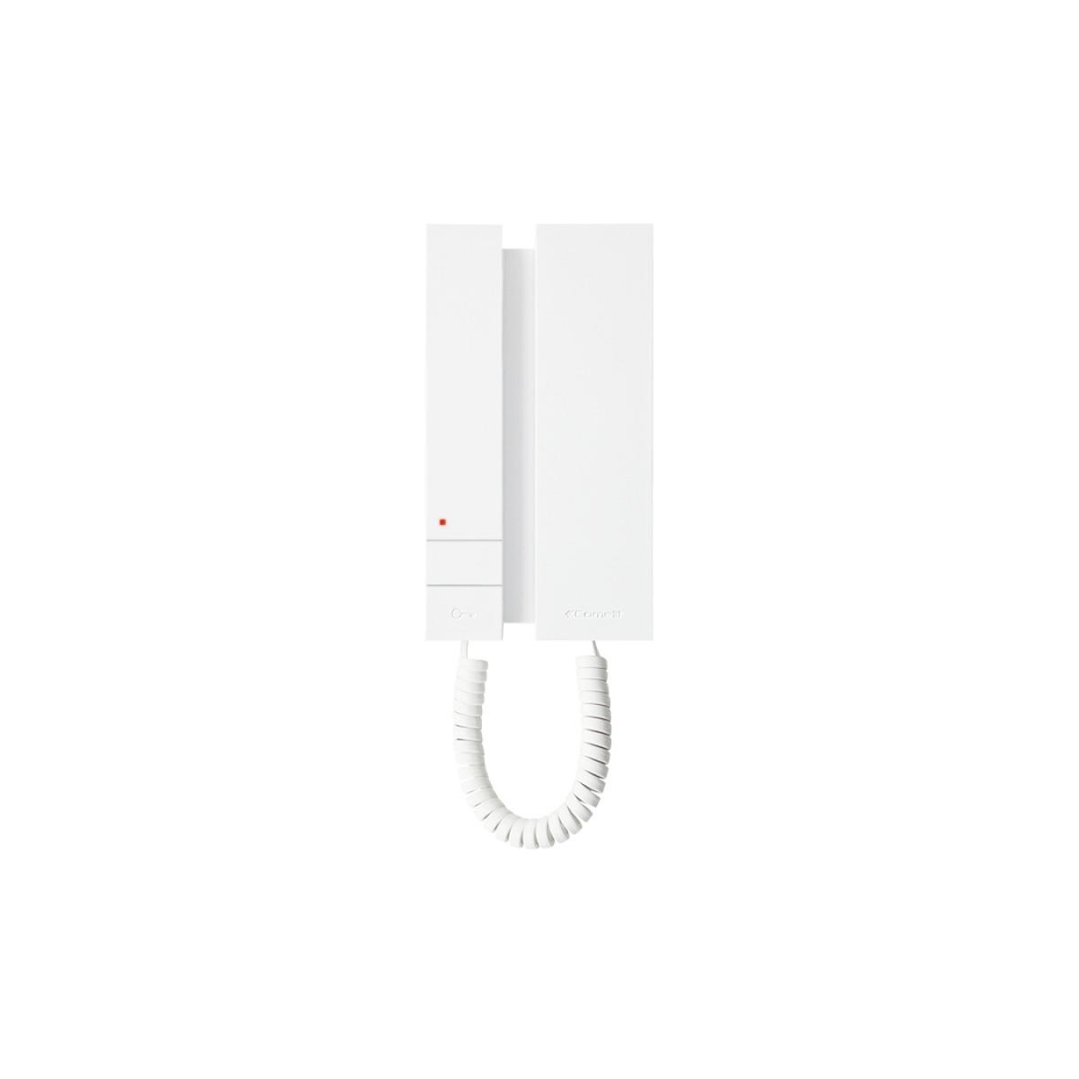 Innenstation Audio, Mini mit Hörer, für 5-Draht mit elektronischem Ruf, Türöffnertaste und zusätzlicher Taste mit potentialfreiem Kontakt (24V / 100mA). Einstellung der Ruflautstärke und Ruftonabschaltung über Wahlschalter mit 3 Stellungen. Die Ruftonabschaltung wird durch ein rotes Symbol angezeigt.