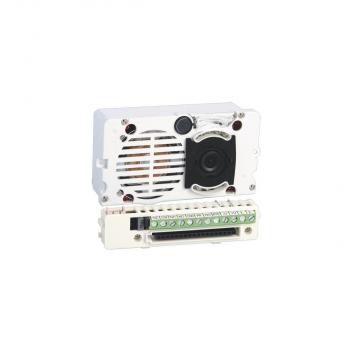 Lautsprechereinheit Audio-Video für 2-Draht-System SB2 mit Klemmenleiste, 1/4'' CCD-Farbvideokamera sowie LED-Beleuchtung für die Videokamera. Diese Lautsprechereinheit ist limitiert auf bis zu vier Teilnehmer. Integriertes Ausstattungsmerkmal ist die Handicap-Funktion nach DIN 18040 mit Zustandsanzeige Türruf, Gesprächsbereit, Türöffnerfunktion und Teilnehmererreichbarkeit visuell mit LED´s hinter genormten Handicap Symbolen sowie akustischer Sprachausgabe der Zustände. Sprechverbindung mit Echounterdrückung, staub- und wasserdichtem Lautsprecher, Elektret-Mikrofon und an der Frontseite einstellbarer Lautstärke des Lautsprechers. Mikroprozessor und 8 DIP-Schaltereinheit für die Adressierung der Teilnehmeradressen. Integrierte elektronische Türöffnerfunktion (3A) und zusätzliche Relaiskontakte C, NC, NO mit 10A. 33V DC-Versorgung über das entsprechende Netzgerät Art. 1209. Für den Einbau in die Module Art. 1250iKV, 1250U, 33410(M), 33411(M) und 33412(M). Abmessungen: 102x55x38mm.