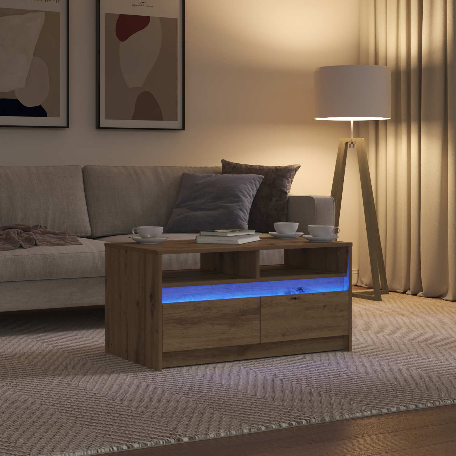 Dieser moderne Couchtisch hat ein stylisches, rechteckiges Design, das perfekt in ein zeitgemäßes Wohnzimmer passt. Mit einem raffinierten Touch funktioniert er nicht nur als funktionales Möbelstück, sondern gibt deinem Raum auch einen eleganten Look. Die Beleuchtung sorgt für warmes Licht und schafft eine einladende Atmosphäre ? sowohl für kleine Zusammenkünfte als auch für den Alltag. Der Holzwerkstoffrahmen bietet dir Sicherheit und Langlebigkeit. LED-Akzentbeleuchtung Flexible LED-Streifen sorgen für angenehmes Licht und bringen Atmosphäre in dein Zuhause. Sie setzen besondere Deko-Elemente oder architektonische Details perfekt in Szene und verleihen deinem Raum Tiefe und visuelles Interesse. Langlebiger Holzwerkstoff Dieser Tisch besteht aus robustem Holzwerkstoff, was für hohe Stabilität sorgt. Das Material hält dem täglichen Gebrauch stand und bleibt dabei stylish, also eine clevere langfristige Investition. Praktische Aufbewahrungsschublade Mit seiner sanft gleitenden Schublade bietet dieser Tisch genug Platz für Zeitschriften, Fernbedienungen und andere Utensilien und hält dein Zimmer ordentlich. Rechteckige Form Die große Tischplatte von 90 x 50 cm bietet genug Fläche für alles ? sei es die Begrüßung von Gästen oder entspannte Momente. Das flache Design passt ideal ins Wohnzimmer und lässt dir die Freiheit für verschiedene Anordnungen. Pflegeleichte Oberfläche Um das frische Aussehen des Tisches zu erhalten, einfach trocken reinigen und aggressive Chemikalien vermeiden. Diese einfache Pflege sorgt dafür, dass der Tisch ein Blickfang in deinem Zuhause bleibt.