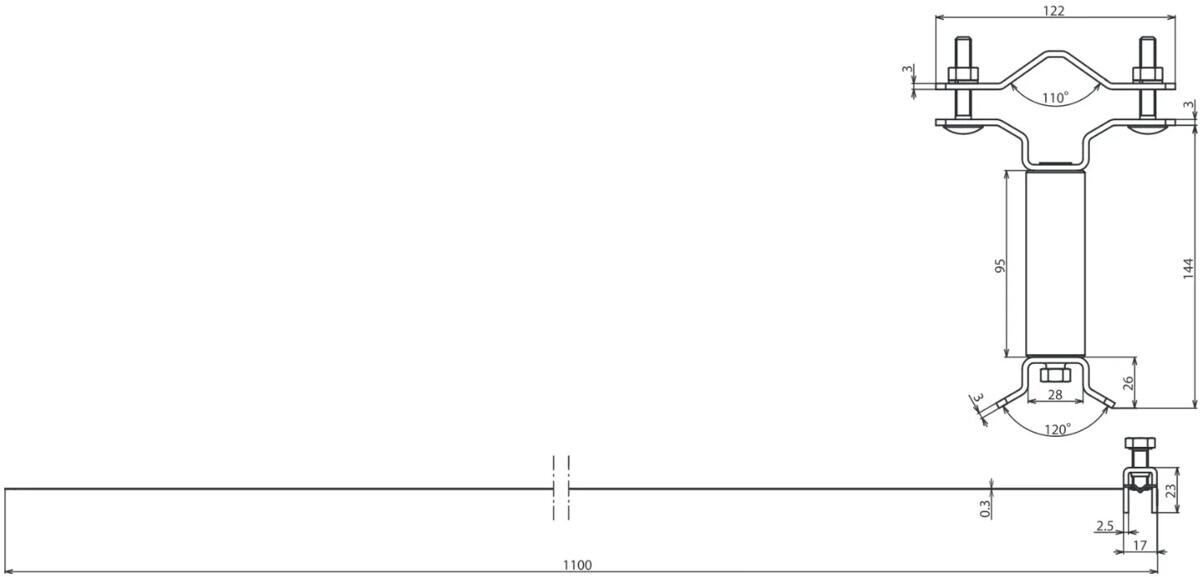 Befestigungsschelle mit Spannband, zum Befestigen der Stützrohre DEHNiso-Combi z. B. am Antennenstandrohr oder anderen Rohren. Ausführung mit Distanzstück Länge 95 mm, um Halterungen von z. B. Antennen auszugleichen..