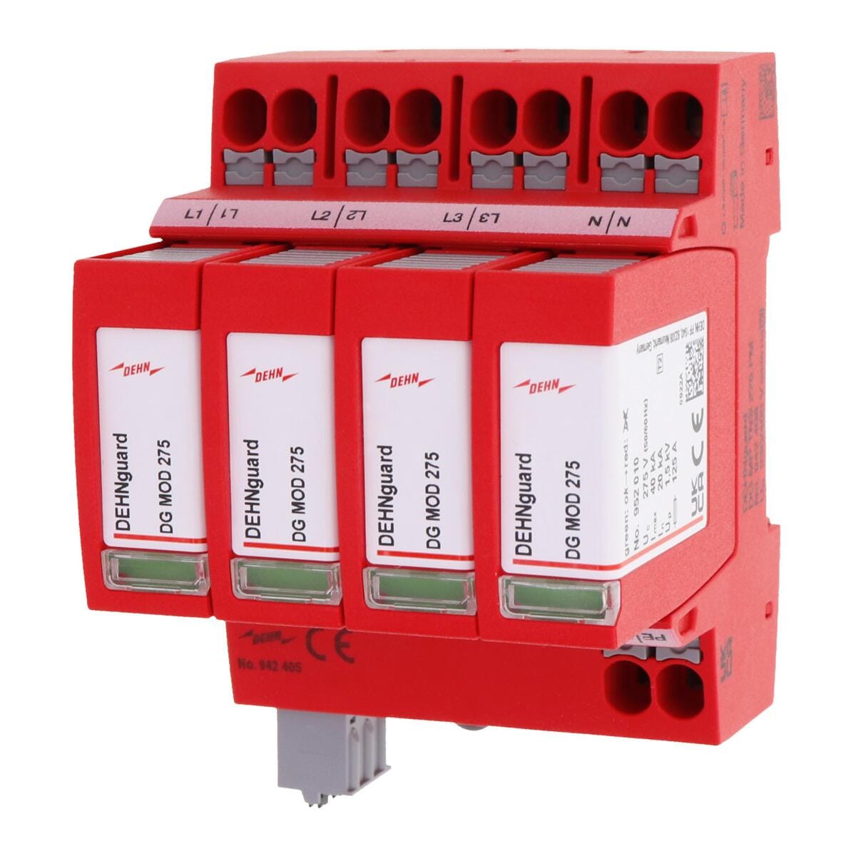Mehrpoliger Überspannungsableiter DEHNguard MP, Typ 2 + Typ 3 nach EN 61643-11, bestehend aus Basisteil mit gesteckten Schutzmodulen und Doppel-Push-In-Anschlussklemme für Stich- und Durchgangsverdrahtung geeignet. Hohe Gerätesicherheit durch Ableiterüberwachung mit Thermo-Dynamik-Control. Zum Schutz von Niederspannungs-Verbraucheranlagen vor Überspannungen. Zum Einsatz im Blitz-Schutzzonen-Konzept an den Schnittstellen 0B ? 1 und höher.