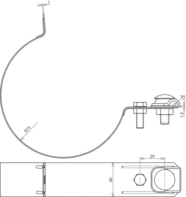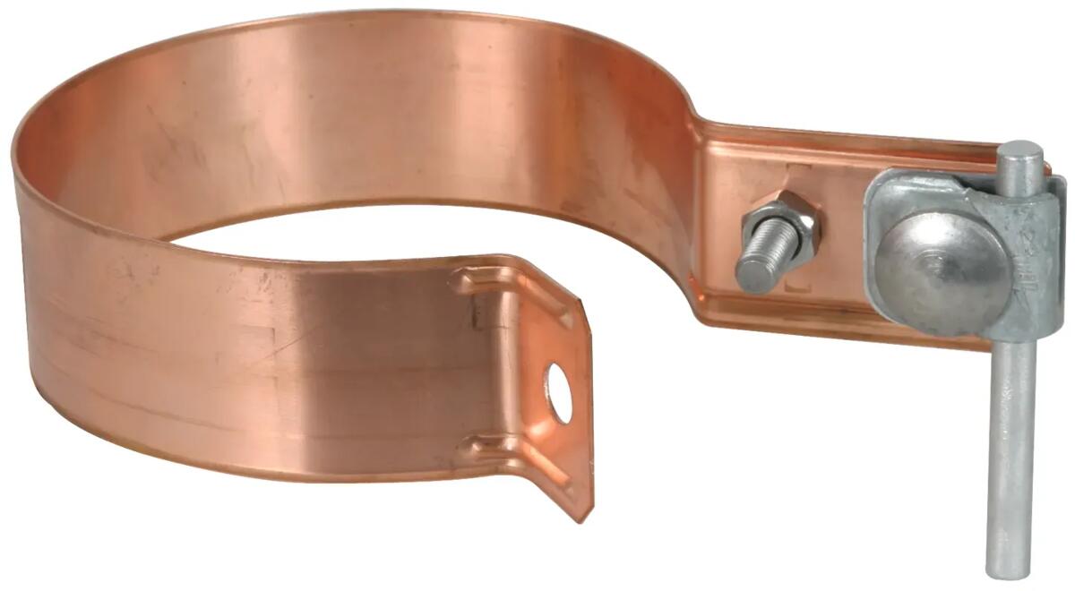 Rohrschelle nach DIN EN 62561-1, zum Anschluss von Regenfallrohren an den Blitzschutz-Potentialausgleich nach DIN EN 62305-3 (VDE 0185-305-3). Anschlussmöglichkeiten D11 mm für Rundleiter z. B. mit KS-Verbinder oder mit Klemmbock. Ausführung Zweimetall, für die Verbindung von Leitungen aus St mit Regenfallrohren aus Cu, mit Klemmbock St/tZn und Zwischenplatte (Cupal), für feste Rohrdurchmesser mit Schraube M8.