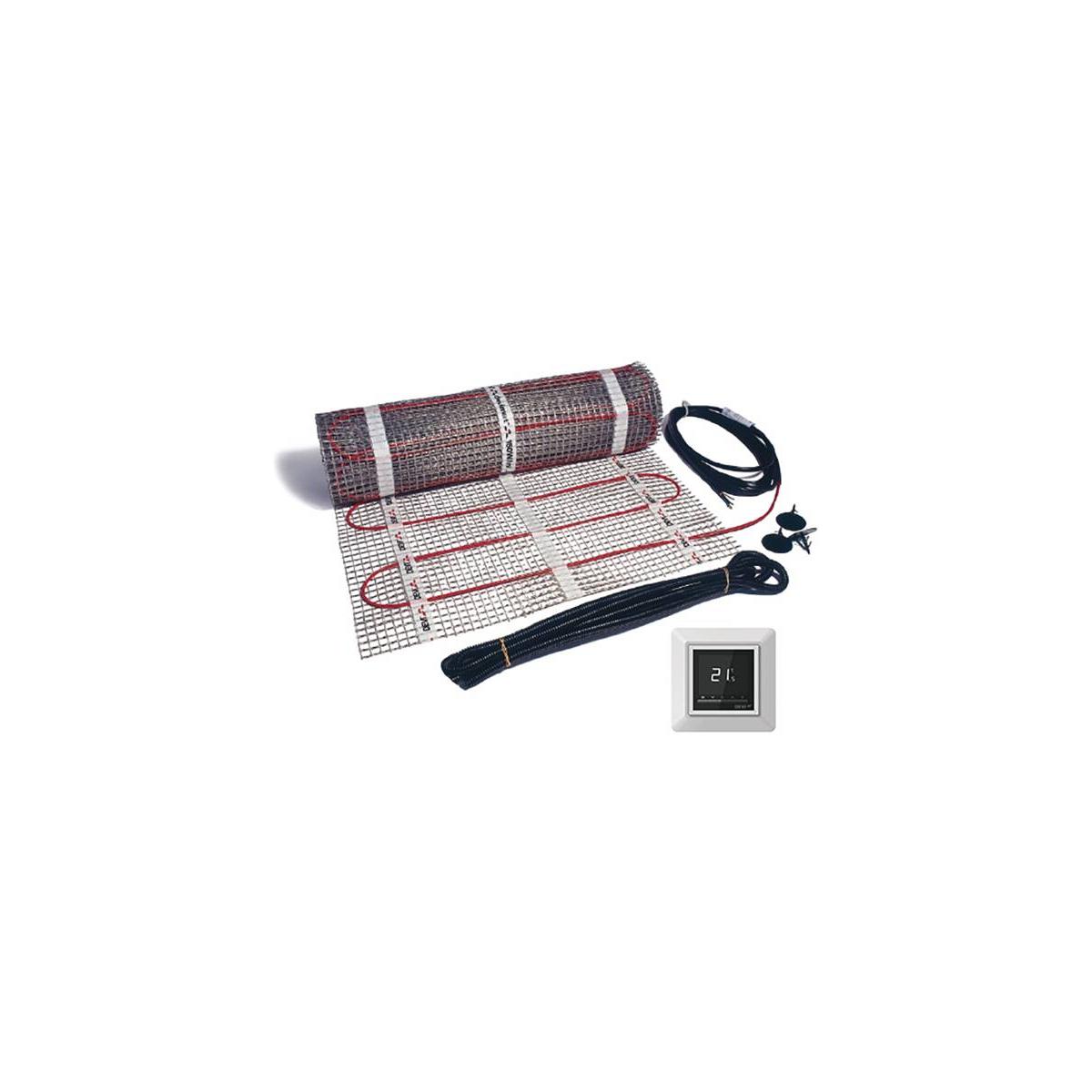 Dünnbett-Set mit Opti Uhrenthermostat, flexiblem Fühlerschutzrohr DN10 , Kunststoffnägel, Montageanleitung. Die selbstklebende Dünnbettheizmatte mit einer Anschlussleitung ist montagefertig konfektioniert und wurde speziell für den Einbau in Ausgleichmasse oder Flexkleber direkt unterhalb des Fußbodenoberbelages entwickelt. Bedingt durch die geringe Aufbauhöhe von nur 4 mm ist sie ideal für die Renovierung und Modernisierung von Bädern, Duschen, Küchen usw. Dieses Fußbodentemperiersystem eignet sich besonders für den nachträglichen Einbau in verwinkelten und/oder großen Räumen, da das Zurückführen des zweiten Anschlusses entfällt. Die Heizleitung mit zusätzlicher Schutzumflechtung zum Einsatz der FI-Schutzschaltung, ist auf einem Kunststoffnetz aufgebracht.