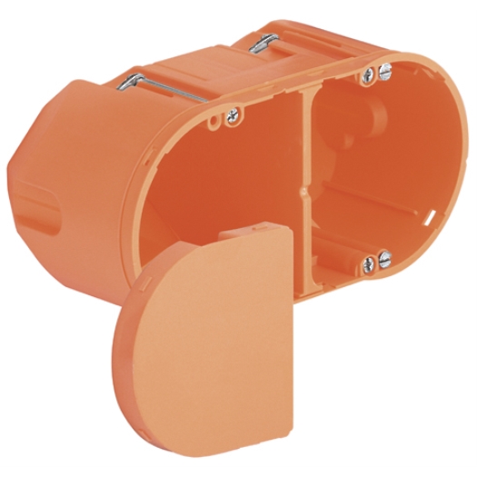 - Tunnel-Zweikammerdose mit beiliegender Trennwand und tapezierfähiger Abdeckung (zur Reduzierung von Schaltgeräuschen), kann die Abdeckung um 180° gewendet und verspachtelt werden