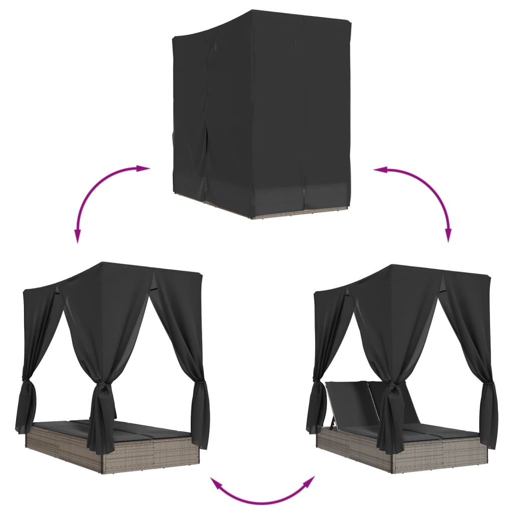 Entspanne dich und genieße deinen Außenbereich auf dieser bequemen Doppelliege! Langlebiges Material: PE-Rattan, auch als Poly Rattan bekannt, ist ein robustes, pflegeleichtes synthetisches Material, das die Optik von natürlichem Rattan aufweist. Es kennzeichnet sich durch ein geringes Eigengewicht und lässt sich einfach reinigen. Aufgrund seiner Haltbarkeit und Witterungsbeständigkeit wird es häufig bei der Herstellung von Gartenmöbeln verwendet.Verstellbare Rückenlehne: Dieses Möbelstück verfügt über eine 4-fach verstellbare Rückenlehne, um stets ganz einfach die bequemste und geeignetste Position zum Entspannen zu finden.Praktisches Dach und Vorhänge: Dank Dach und Vorhänge genießt du den ganzen Tag über ein kühles und angenehmes Plätzchen in deinem Außenbereich.Bequemes Sitzerlebnis: Dieser Gartensessel mit dick gepolsterten Kissen bietet ein angenehmes Sitzgefühl.Abnehmbarer und waschbarer Bezug: Diese Sitzkissen verfügen über abnehmbare Bezüge für einfaches Waschen und Pflegen. Gut zu wissen:Wir empfehlen dir, deine Gartenmöbel mit einer wasserdichten Hülle zu schützen, um lange Zeit eine ansprechende Optik aufzuweisen.
