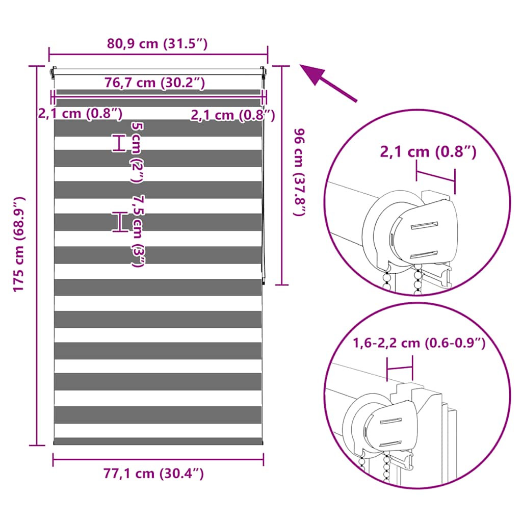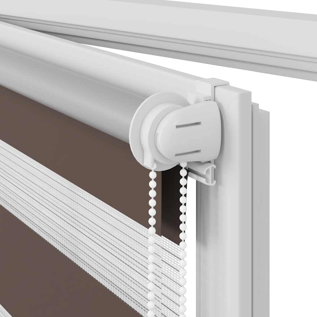 Den neusten Trend in Sachen Licht- und Sichtschutz bietet Ihnen dieses hochwertig verarbeitete Doppelrollo. Durch die 2 parallel verlaufenden Stoffbahnen mit abwechselnd gewebten, transparenten und blickdichten Streifen können Sie mit Hilfe des Kettenzuges das einfallende Licht ganz individuell dosieren. Dabei entstehen wundervolle Lichtspiele.Bitte wählen Sie aus 11 unterschiedlichen Größen.Einfache Bedienung durch Seitenzugkette, das Rollo kann in jeder Höhe gestoppt werden, dies ermöglicht eine komplette oder auf Wunsch nur teilweise Verdunklung des jeweiligen Raumes.Die Klemmhalter werden einfach auf die Innenkante des oberen Fenster-flügels gesetzt. Jegliches Bohren entfällt.Material:100 % Polyester, mit Metallwelle 18 mm (Durchmesser)Kette 2 m lang, Kettenfarbe: weißBitte beachten Sie, dass hier angegebene Bestellmaß ist das Trägeraußenmaß, das Stoffmaß des Rollos ist ca. 3 cm geringer. WARNUNG: Kleine Kinder könnten von Schlaufen in Zugschnüren, Ketten, Bändern oder Innenschnüren, welche das Produkt betreiben, stranguliert werden. Um Strangulation oder Verfangen zu vermeiden, halten Sie Schnüre und Kordeln außerhalb der Reichweite von kleinen Kindern. Schnüre könnten sich um den Hals des Kindes wickeln. Schieben Sie Möbel wie Betten oder Kinderbetten weg von Fensterrolloschnüren. Knoten Sie die Schnüre nicht aneinander. Stellen Sie sicher, dass die Schnüre sich nicht verwickeln und keine Schlaufen bilden. Der Lieferumfang umfasst 1 x 80 cm obere Aluminiumschiene mit 77 x 175 cm Stoff in Zebramuster, 1 x 80 cm obere Schiene, 1 x 80 cm schwere untere Schiene, 2 x Haken, 2 x Bügel, 1 x Kettenhalter, 2 x Dichtungsring und 1 x Kugelkette.