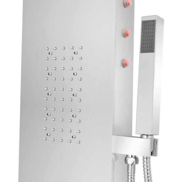Dieses multifunktionale Duschpaneel zeichnet sich durch sein stilvolles Design aus und ist eine großartige Ergänzung für jedes Badezimmer. Diese Duschkabine besteht aus strapazierfähigem Edelstahl mit einer gebürsteten Oberfläche und besitzt ein wunderschönes, abgerundetes Design. Sie verfügt über vier Modi: Regenfalldusche, Kaskadendusche (Wasserfall), Massagedüsen und einen Handduschkopf, welche ganz einfach mit einem Regler ausgewählt werden können. Tauche ein in ein wirklich entspannendes Duscherlebnis und genieße das moderne Design dieses formschönen Duschpaneels! Hinweis: Gas- und Solar-Durchlauferhitzer eignen sich nicht für die Verwendung von Thermostatarmaturen. Leitungswasser, das pulverartige Partikel, feste Klumpen oder weiche Teile enthält, kann die Empfindlichkeit des Thermostatventils verringern und die Nutzungsdauer der Thermostatarmatur verkürzen.